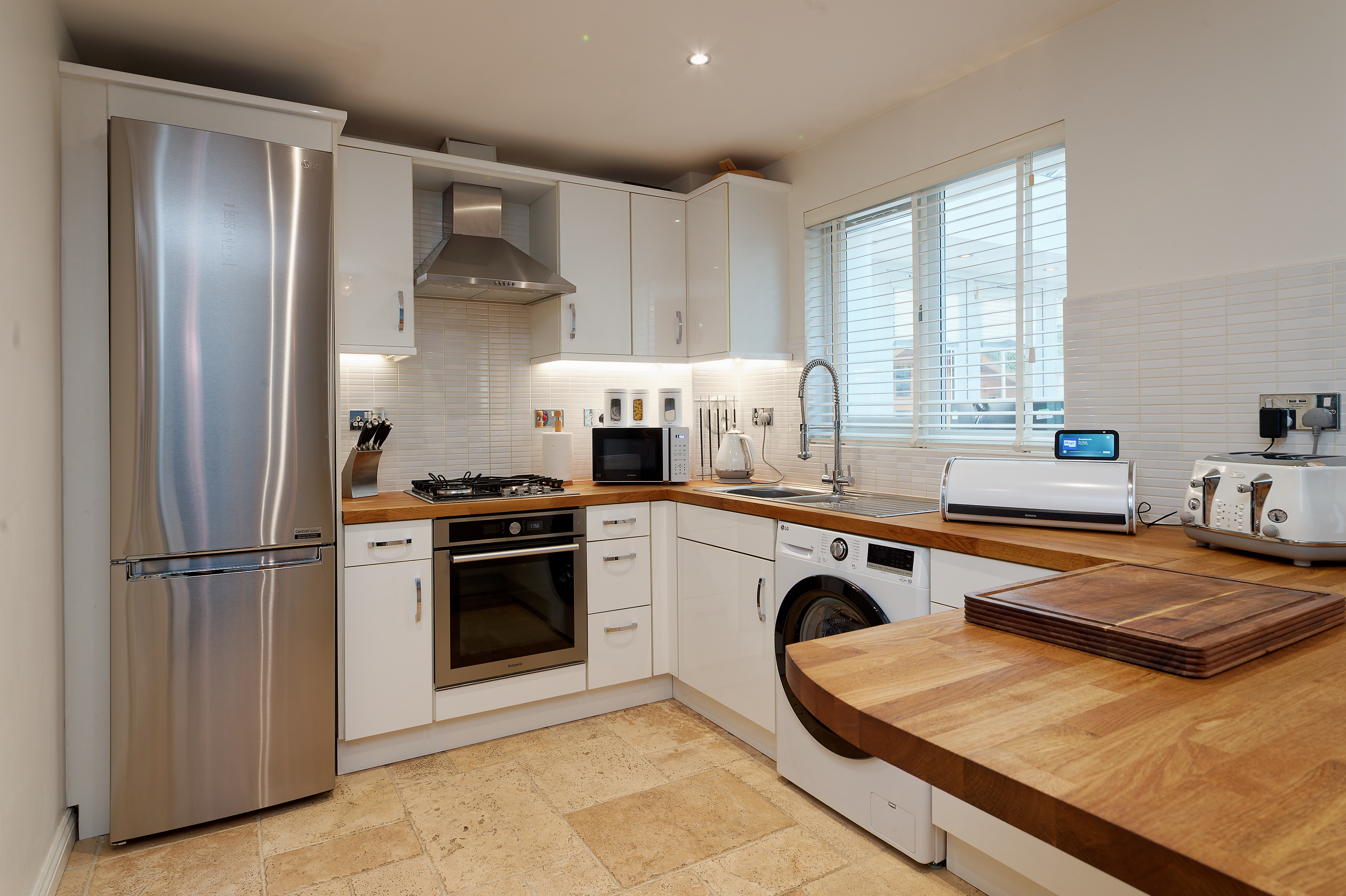 To the rear, the modern dining kitchen is fitted with contemporary units, a breakfast bar, integrated oven and hob, and ample space for appliances including a washing machine and fridge freezer. There’s plenty of room for family dining, making it the heart of the home.