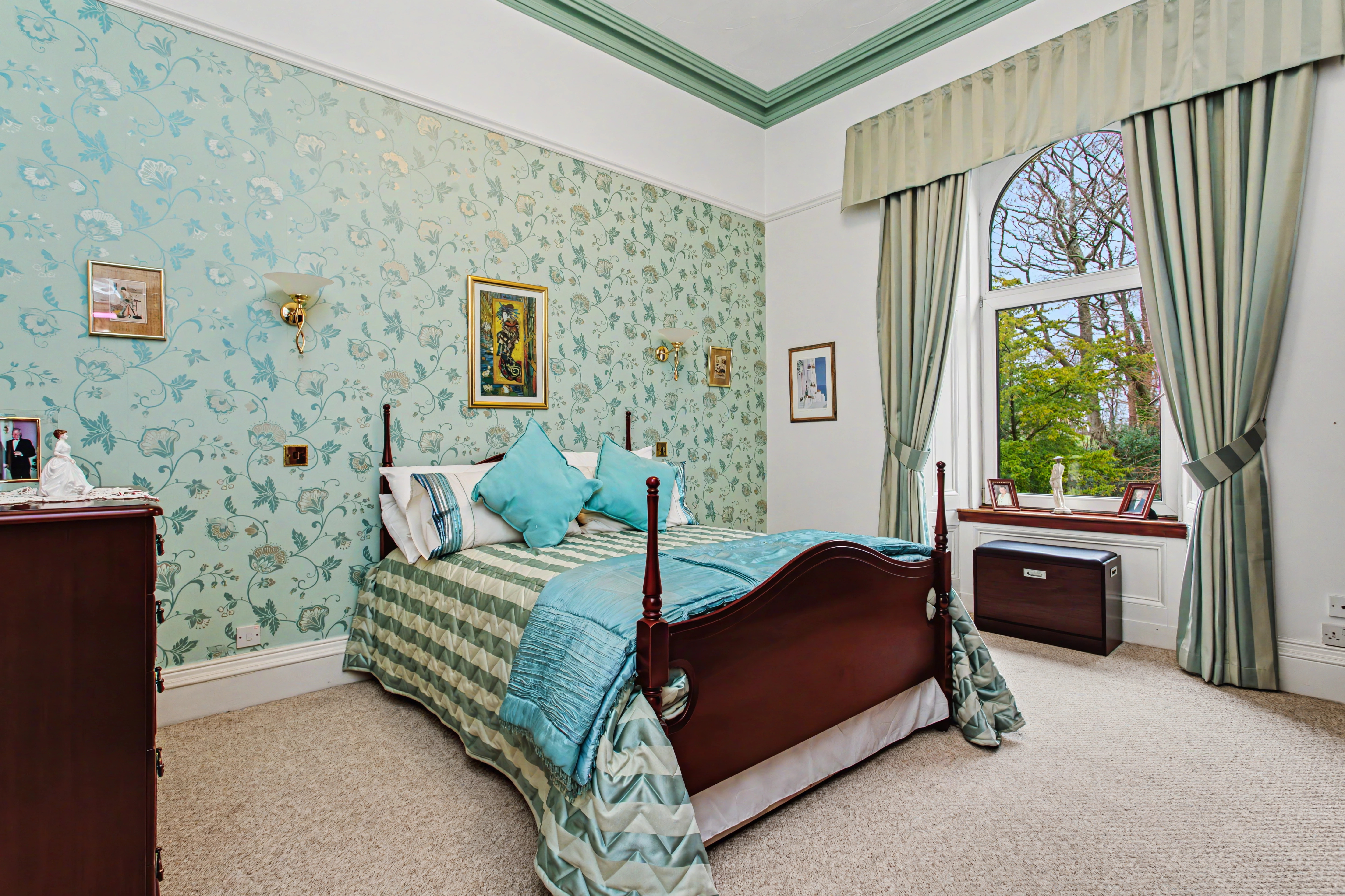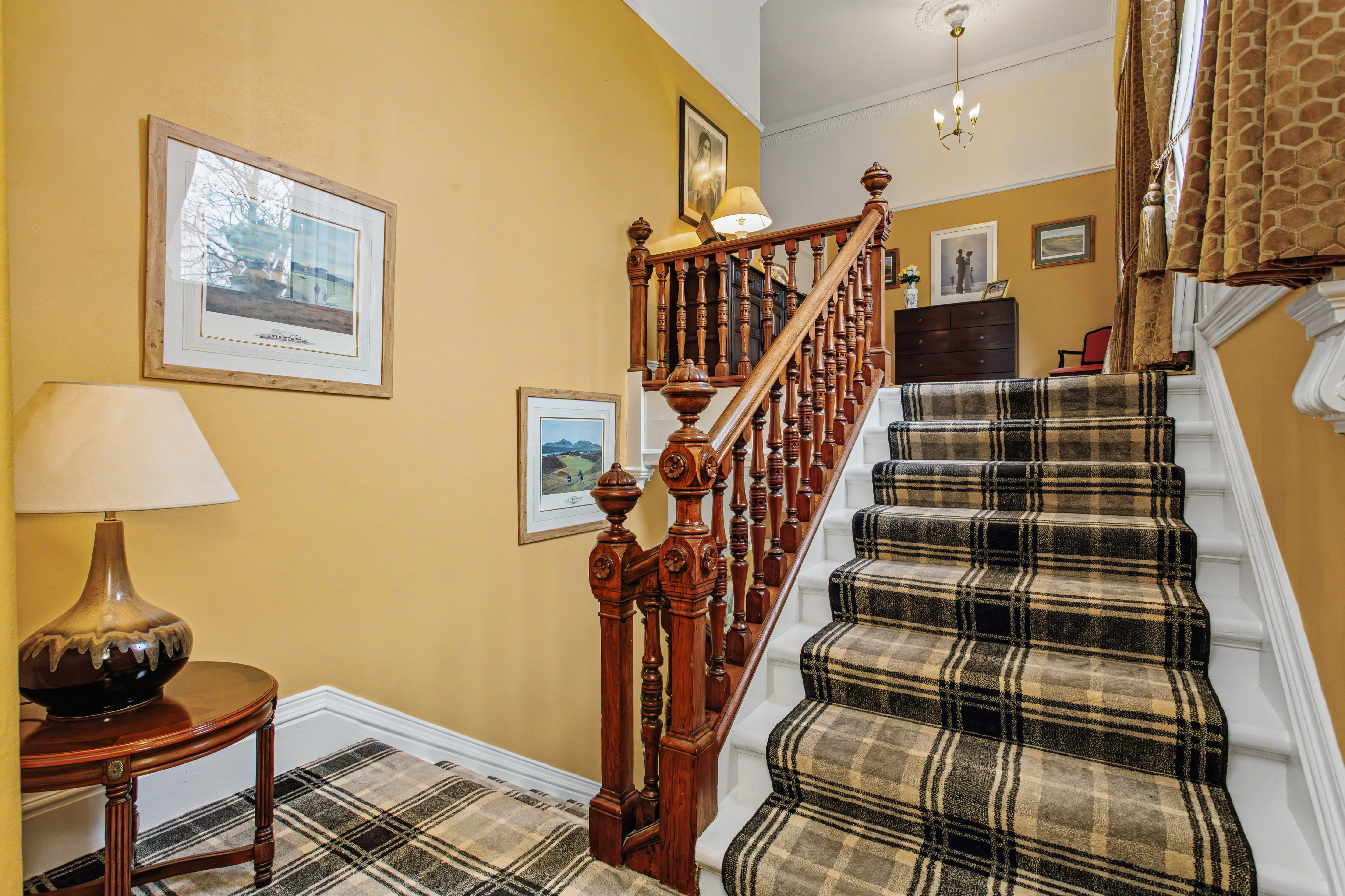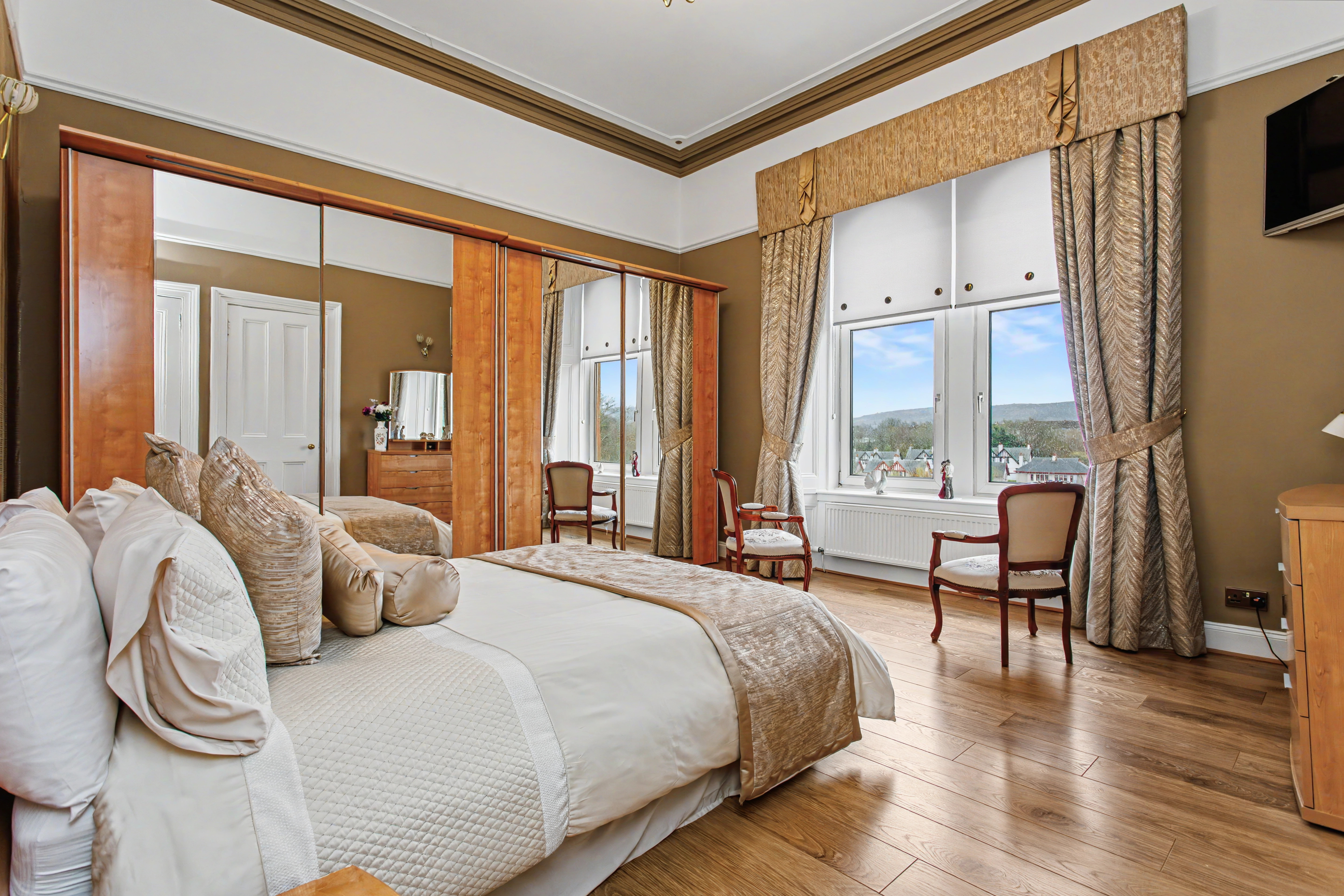 The period stairwell with carpet runner splits to a first floor principal bedroom that is a fabulous 9m long and has the benefit of not only the views but an ensuite Jacuzzi shower complete with separate sauna. The broad upper hallway then leads to three further double bedrooms including the guest bedroom with en suite shower room and a contemporary house bathroom.