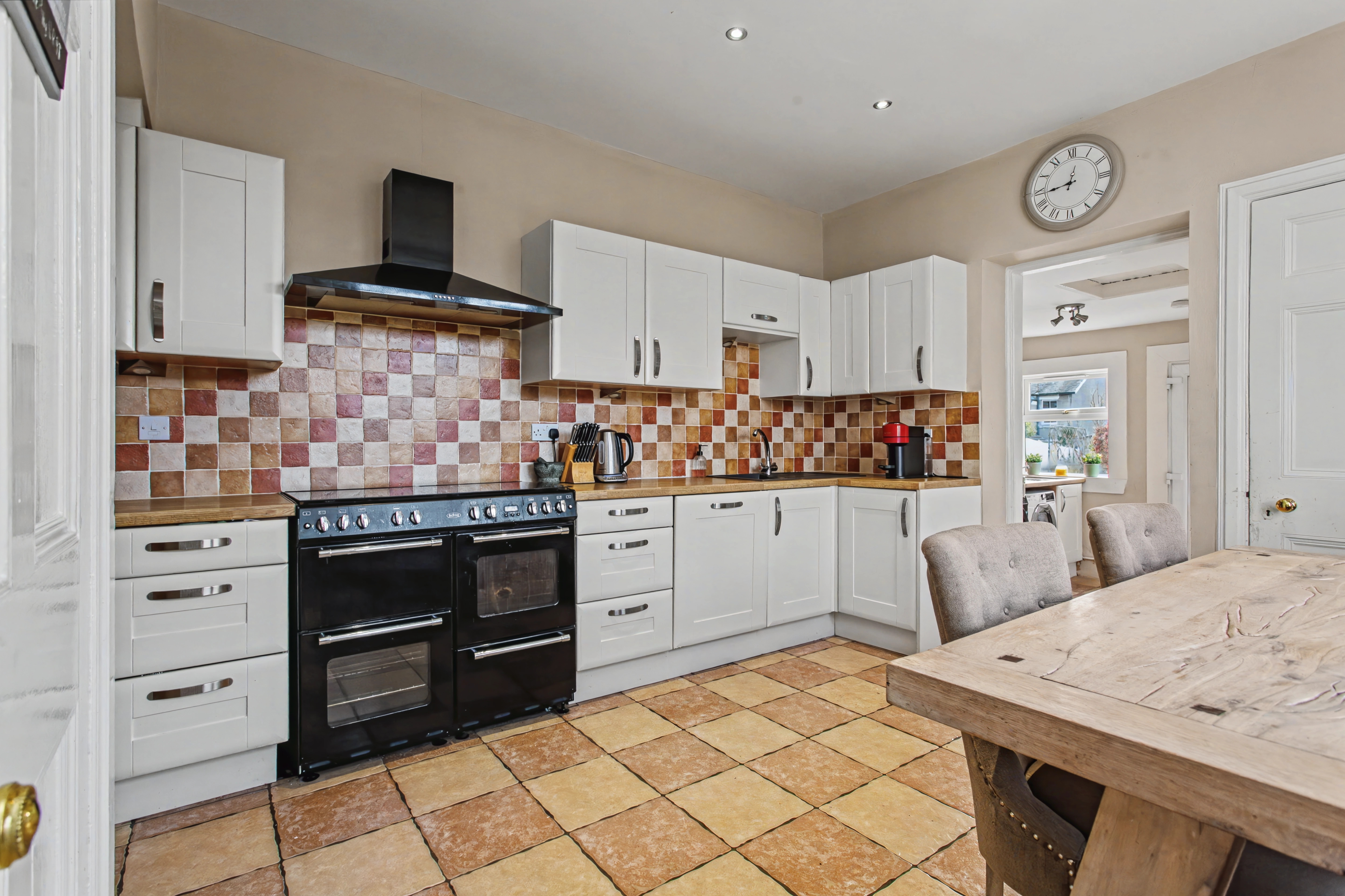 At the heart of the home lies the dining kitchen, a well-proportioned and highly functional space fitted with a range cooker, dishwasher and ample room for a fridge freezer. A traditional pantry adds to the period charm while offering excellent storage. Just off the kitchen, the utility room provides a practical family hub with additional units, a second sink and space for laundry appliances—perfect for muddy boots, school bags or pets. A convenient WC is located just off this area.