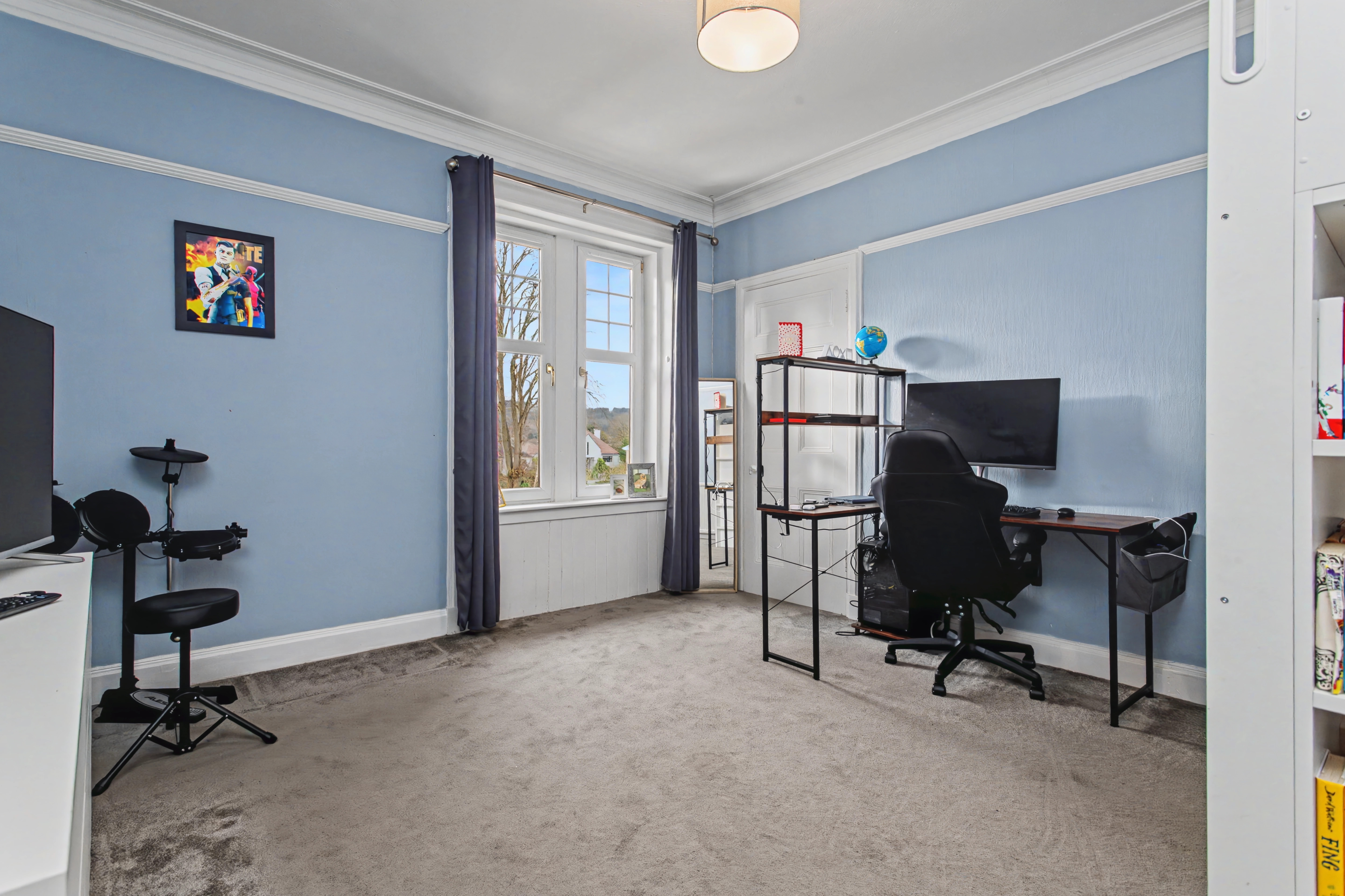 The beautiful stairwell leads to a half-landing where you’ll find a generous double bedroom and a stylish family bathroom, finished with elegant gold-tone fittings and a bath with overhead shower. The upper level hosts three further bedrooms, including the impressive principal bedroom, which enjoys far-reaching views across Paisley and towards the rolling hills beyond—some of the finest vistas in the home.