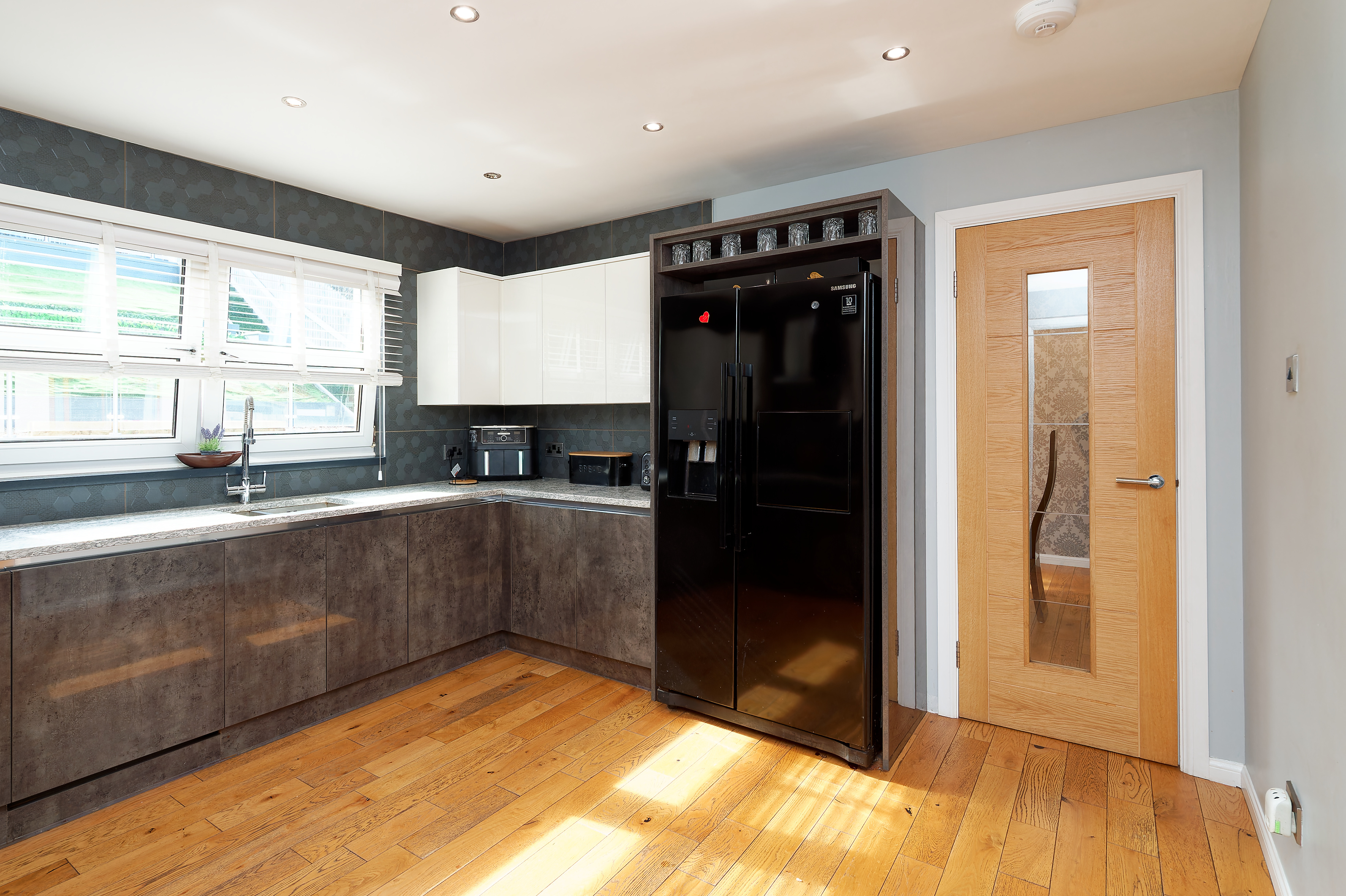 Modern fitted kitchen with plenty of storage and appliances including a dishwasher, hob, oven, microwave and American style fridge freezer.