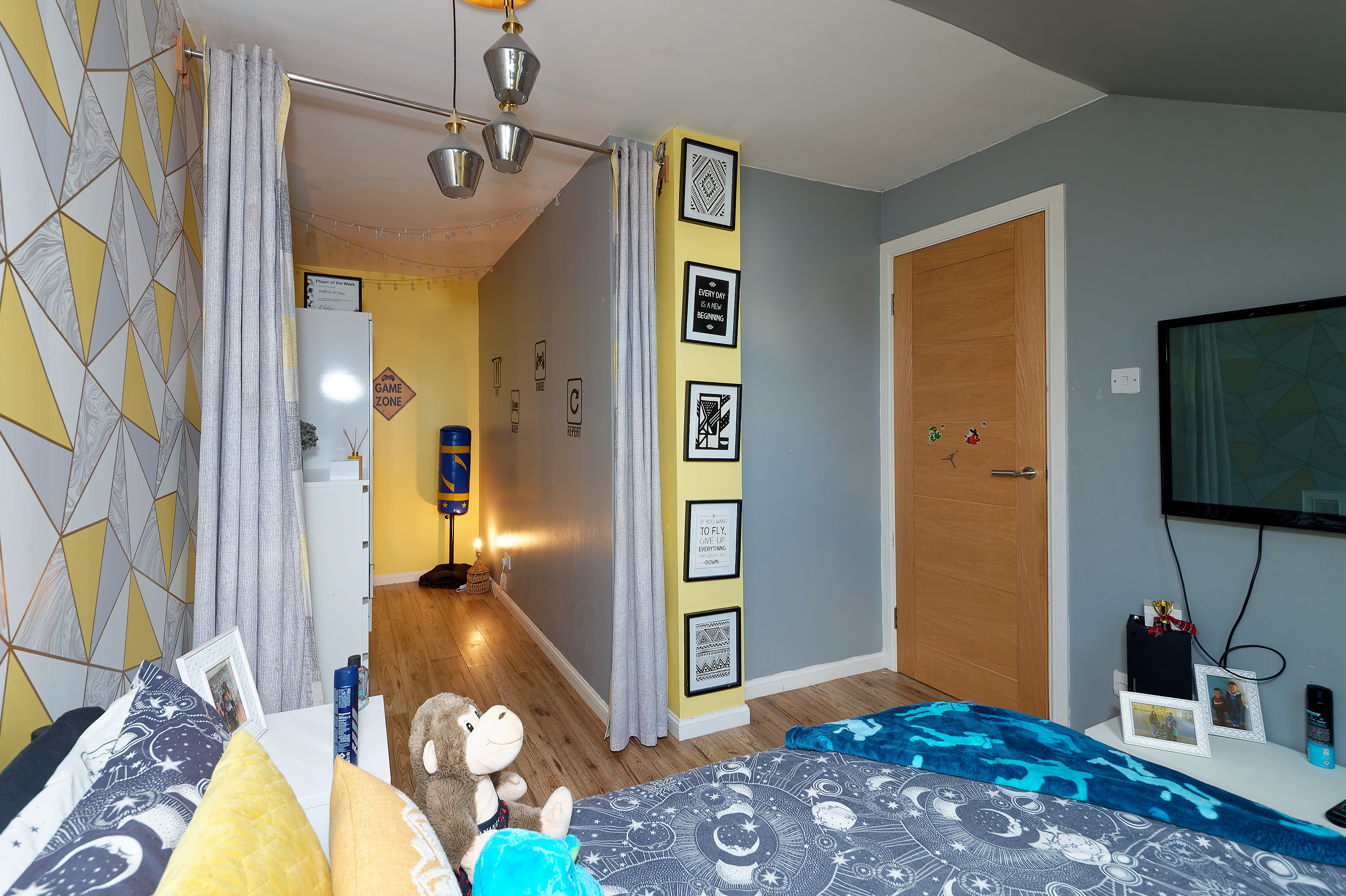 To the front there is another garden with artificial grass and a driveway for off street parking.
