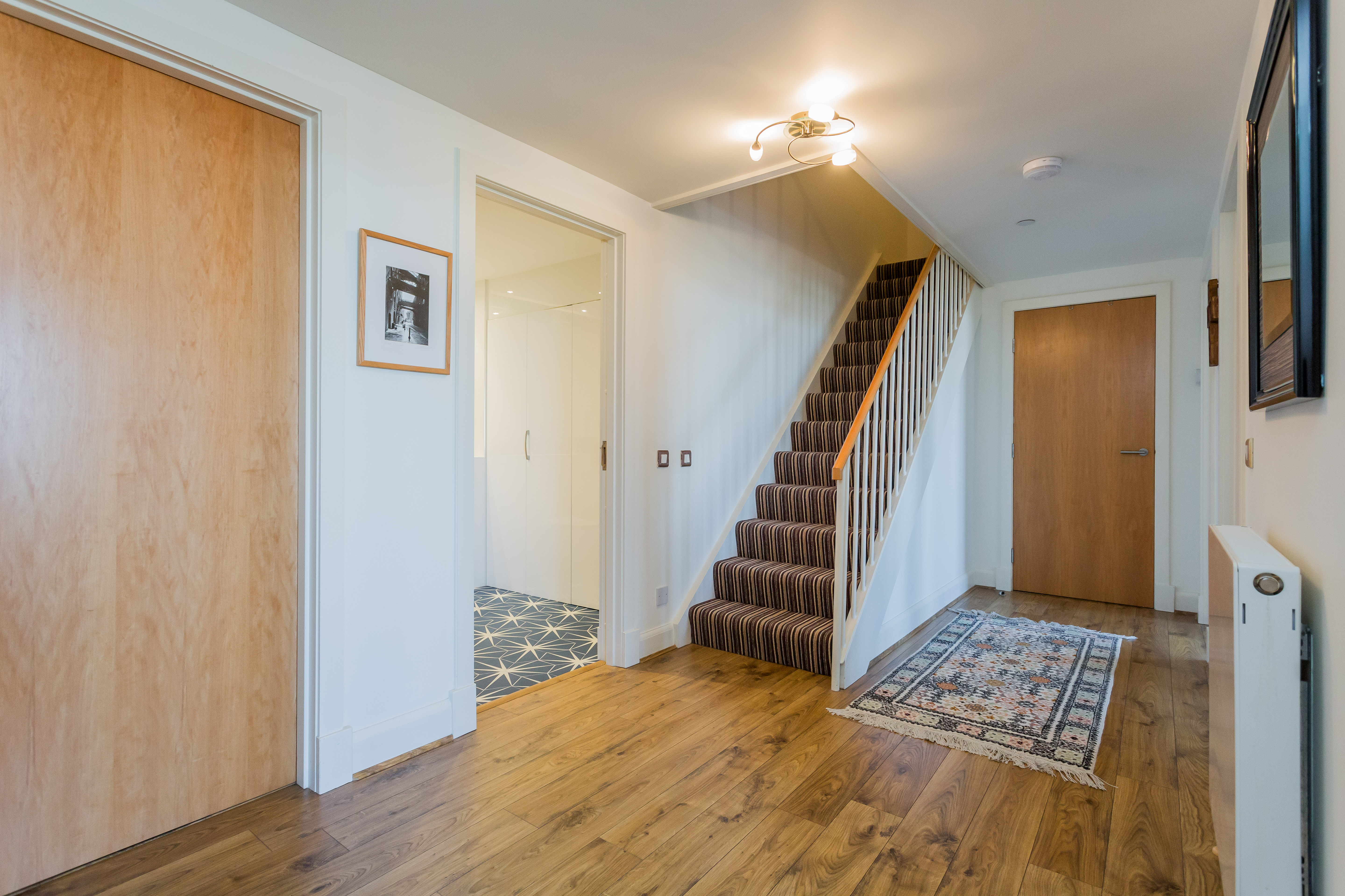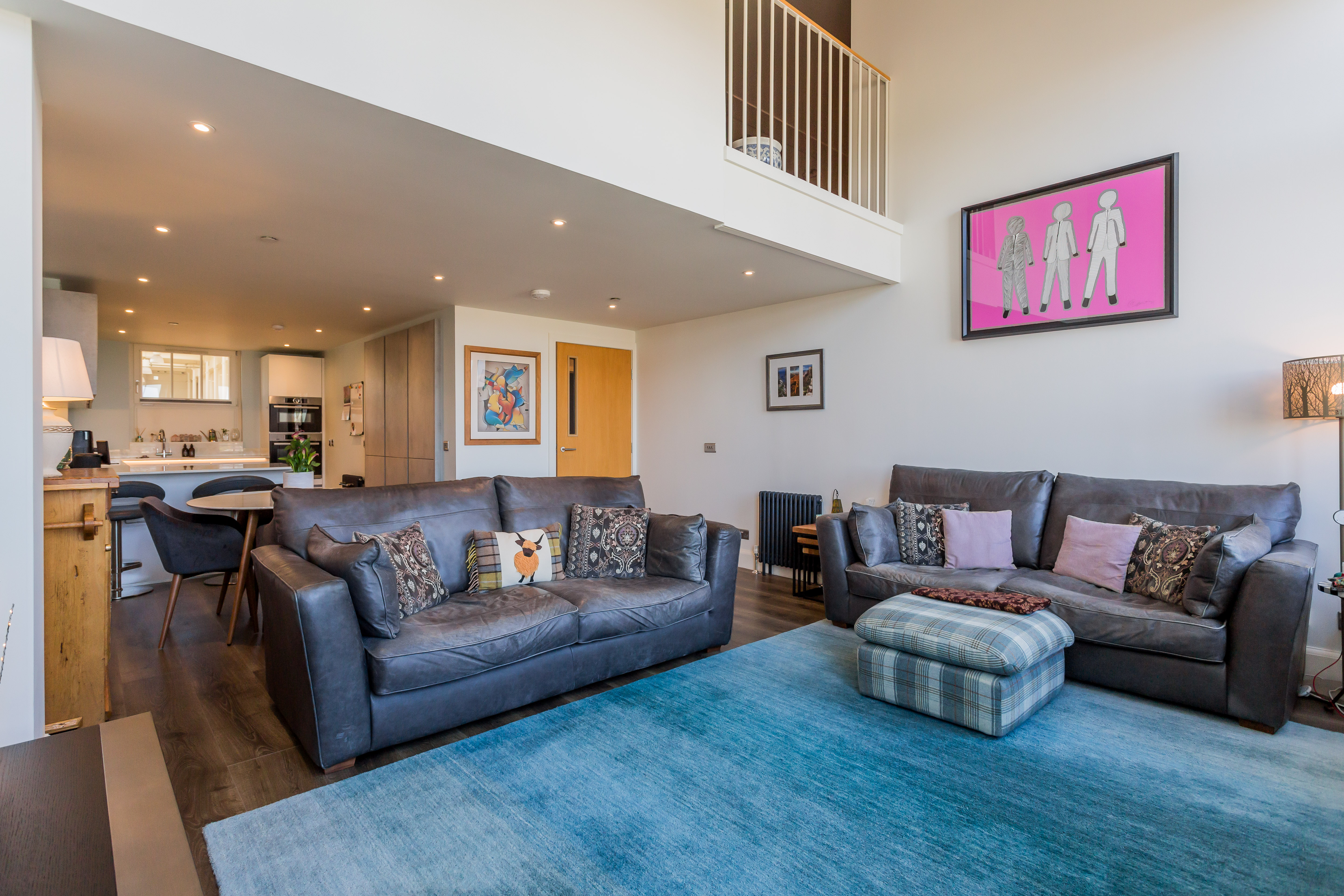 The extensive mezzanine level offers a highly versatile space, currently enjoyed as a cosy second sitting room, perfect for quiet relaxation or an elegant home office. A well-appointed family bathroom on the upper floor services the living areas. The apartment benefits from an upgraded electric wet central heating system, ensuring year-round comfort and excellent water pressure.