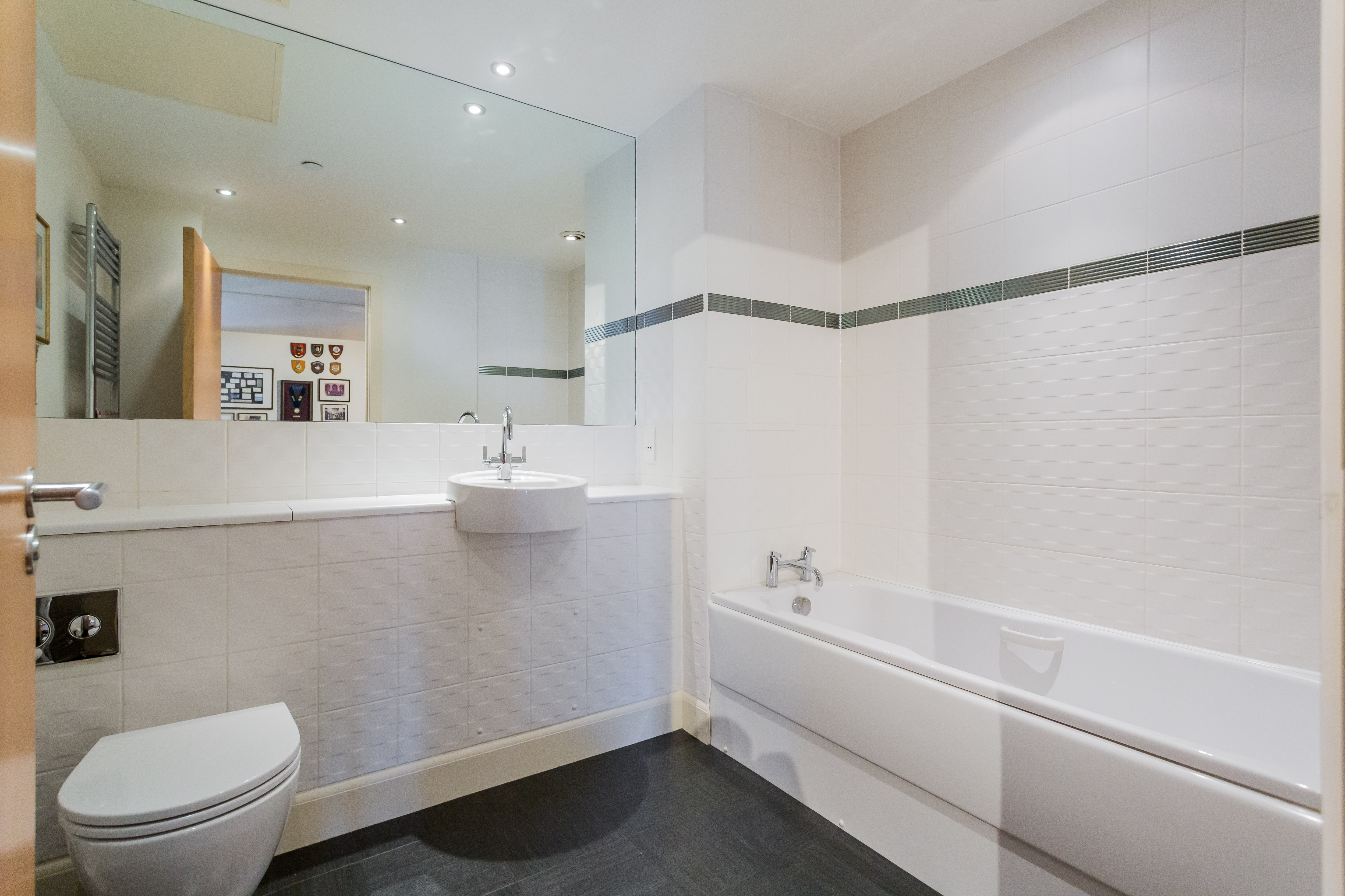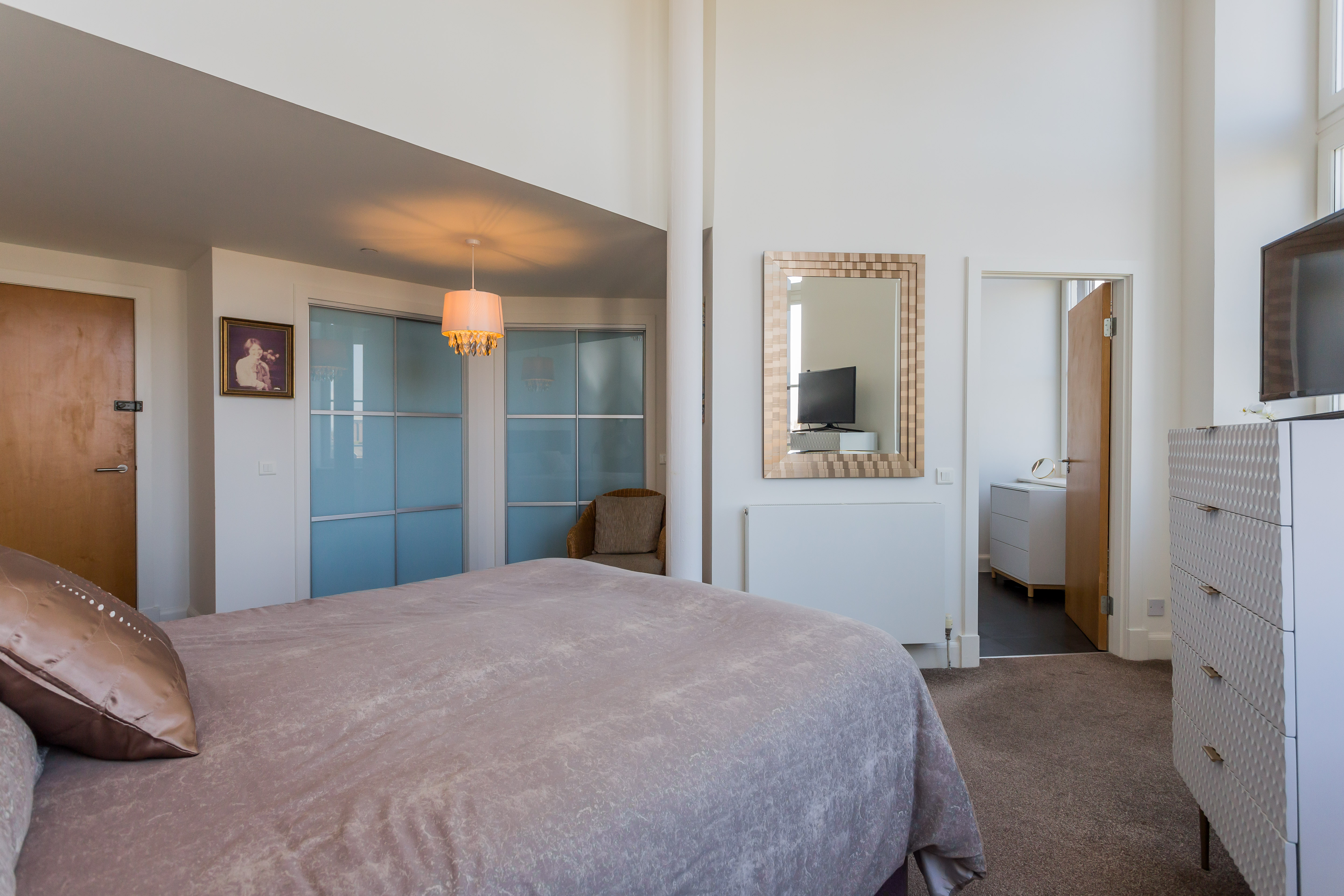 The apartment's luxurious feel extends to its three bedrooms. The primary suite is a true sanctuary, a space that would not be out of place in a boutique luxury hotel. With its own soaring ceilings, dramatic windows, and illuminated sets of double fitted wardrobes, it is completed by an incredible en-suite shower room featuring exquisite Porcelanosa tiling and a walk-in shower. The second bedroom, also with stunning views and illuminated fitted wardrobes, offers flexible use and is currently configured as a formal dining room. The third bedroom, located on the upper level, provides an ideal and private guest suite with its own large en-suite and fitted illuminated wardrobes, ensuring comfort and privacy for visitors.