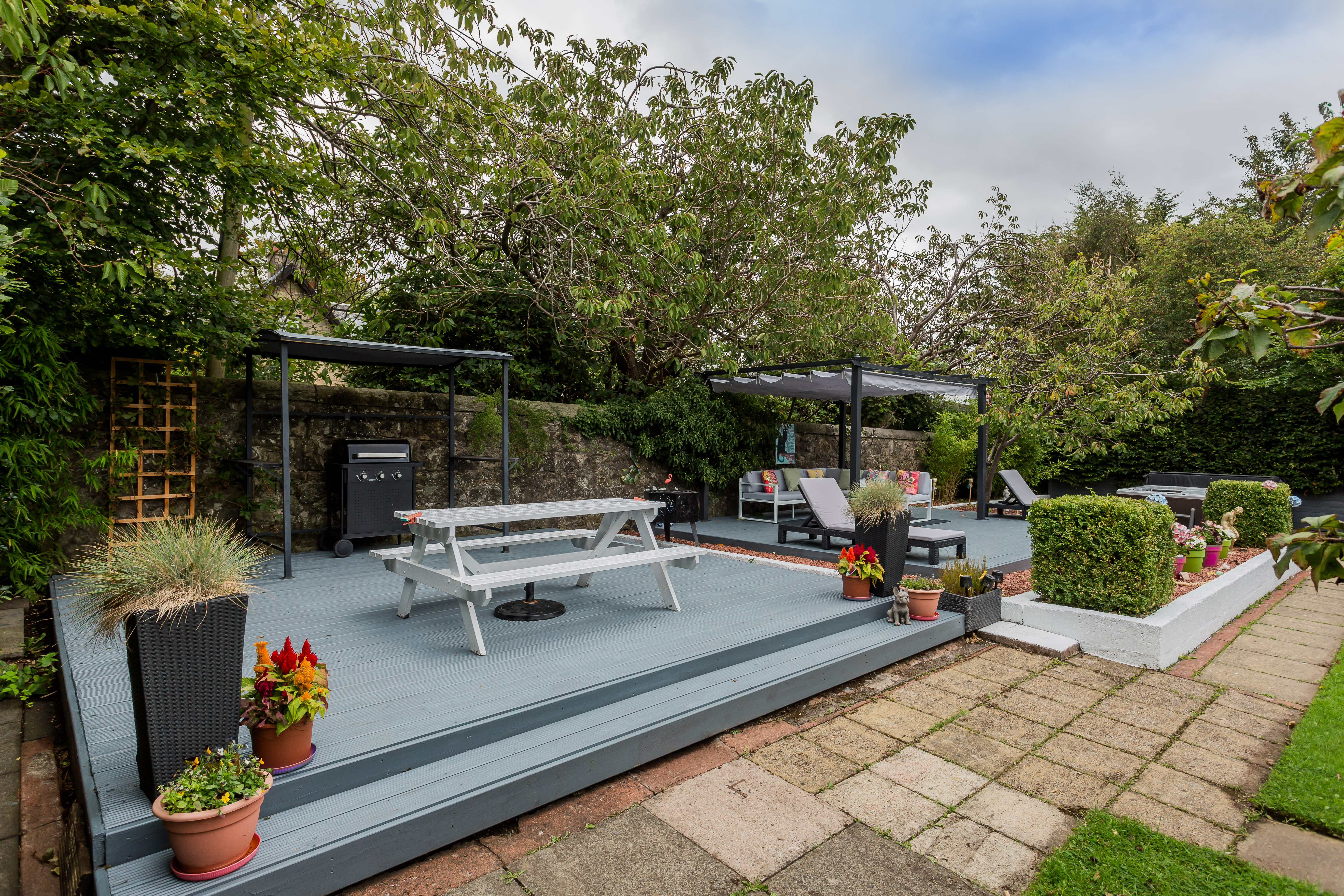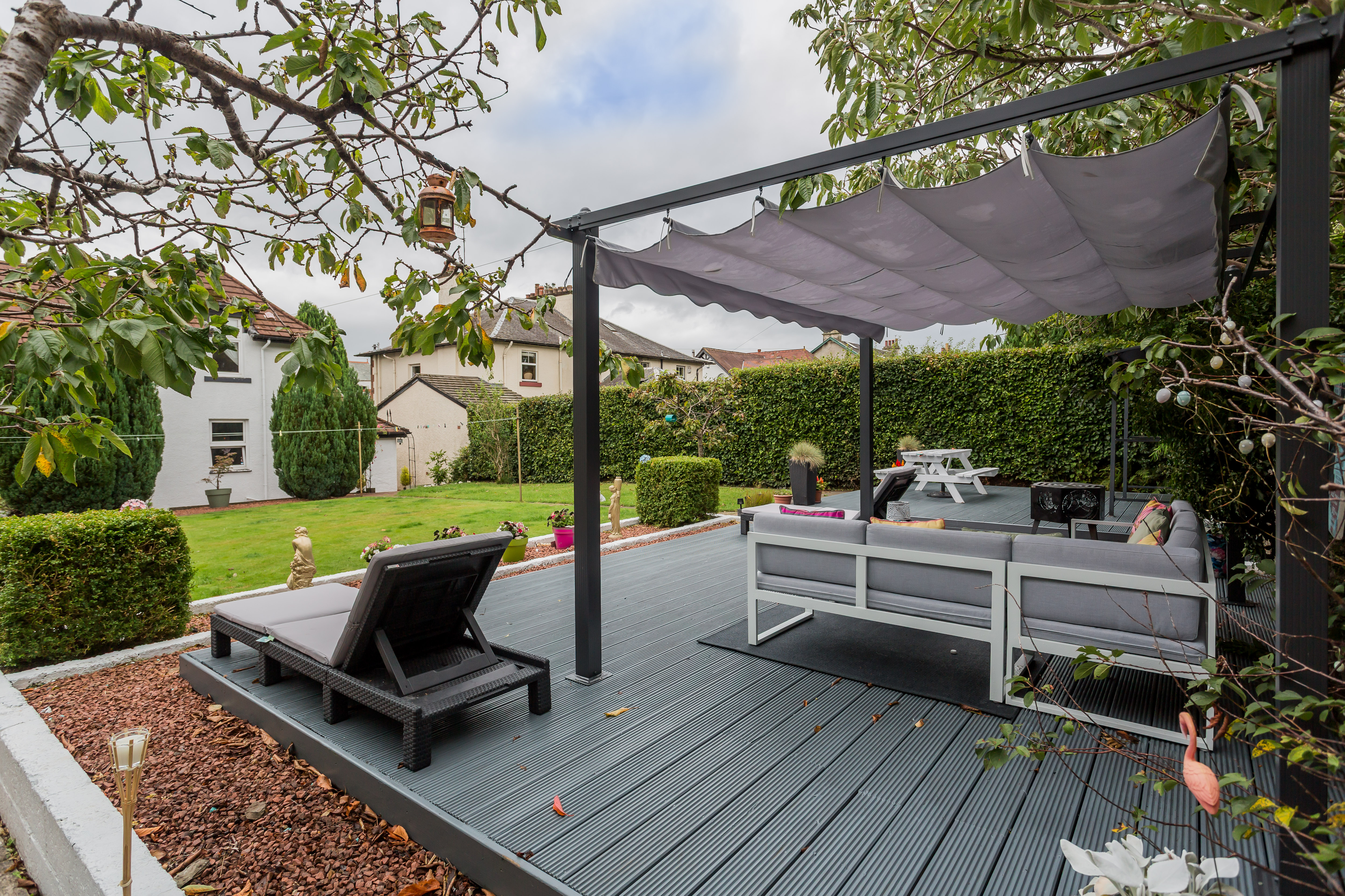 The seating area at the foot of the garden is perfect for enjoying the weather and social gatherings.