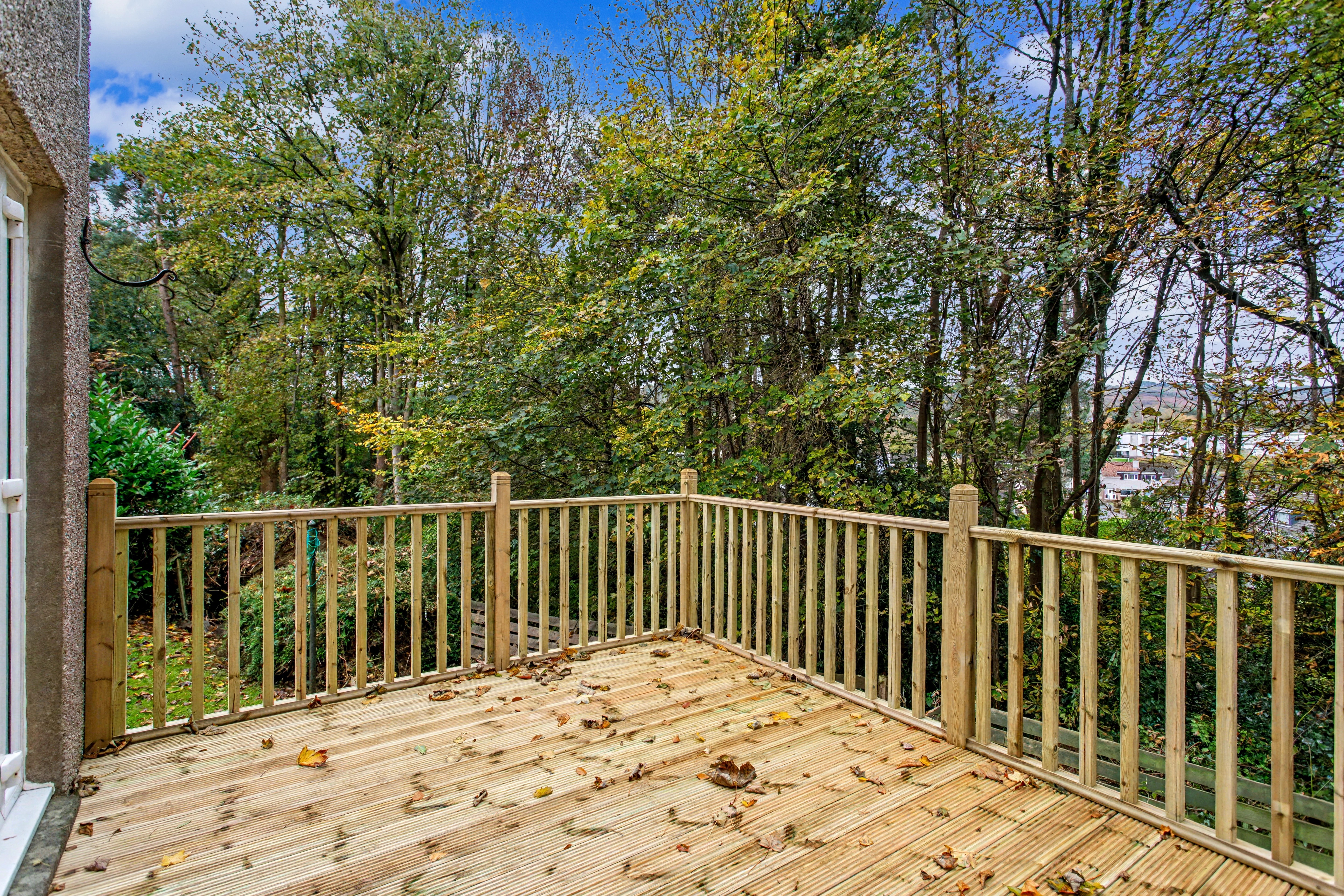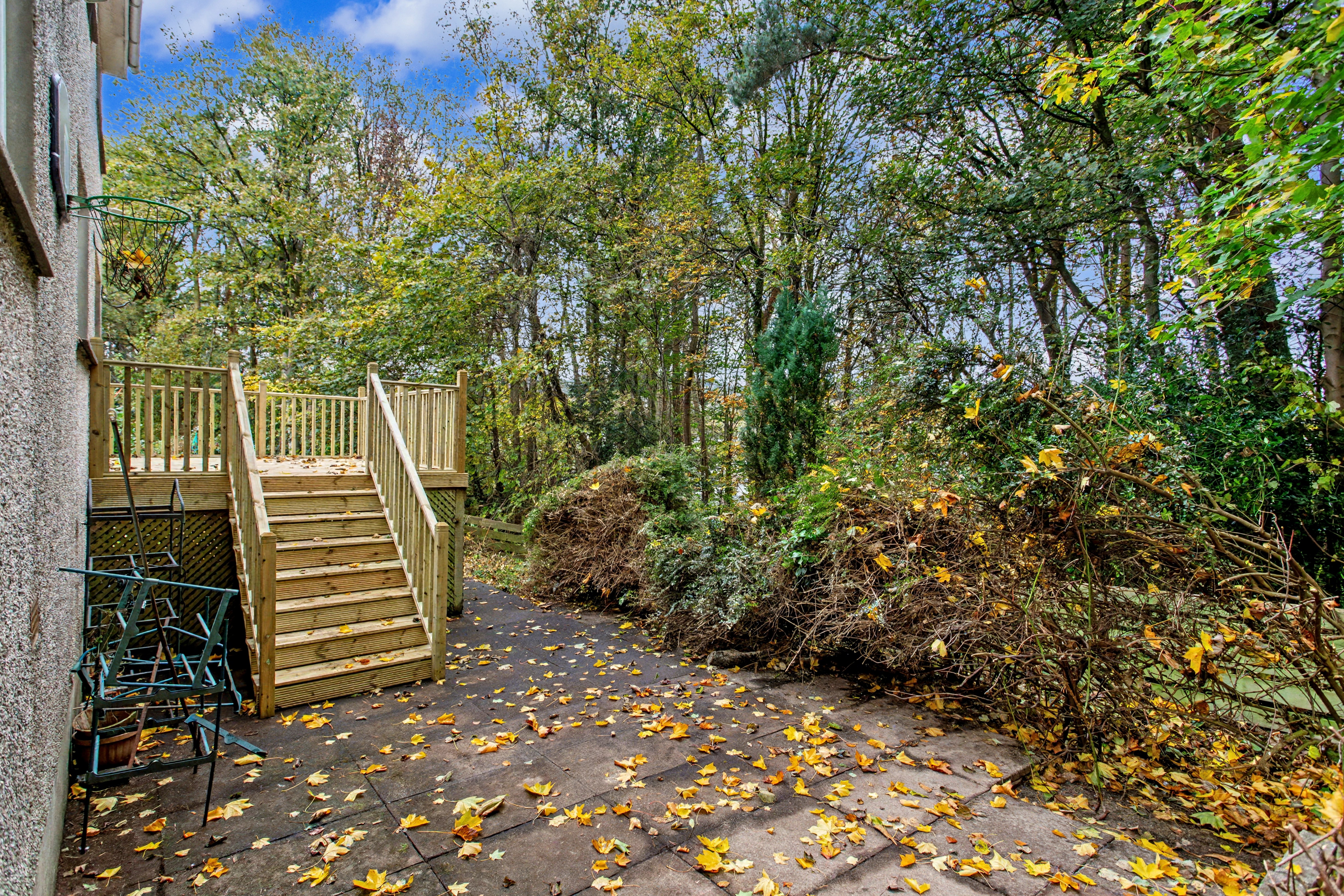 The property occupies a substantial plot with gardens to the front, side, and rear. Lawned areas sit to either side of the house, while the rear garden is bordered by attractive woodland, offering privacy and a peaceful outlook. A timber deck and paved patio create ideal outdoor entertaining spaces.