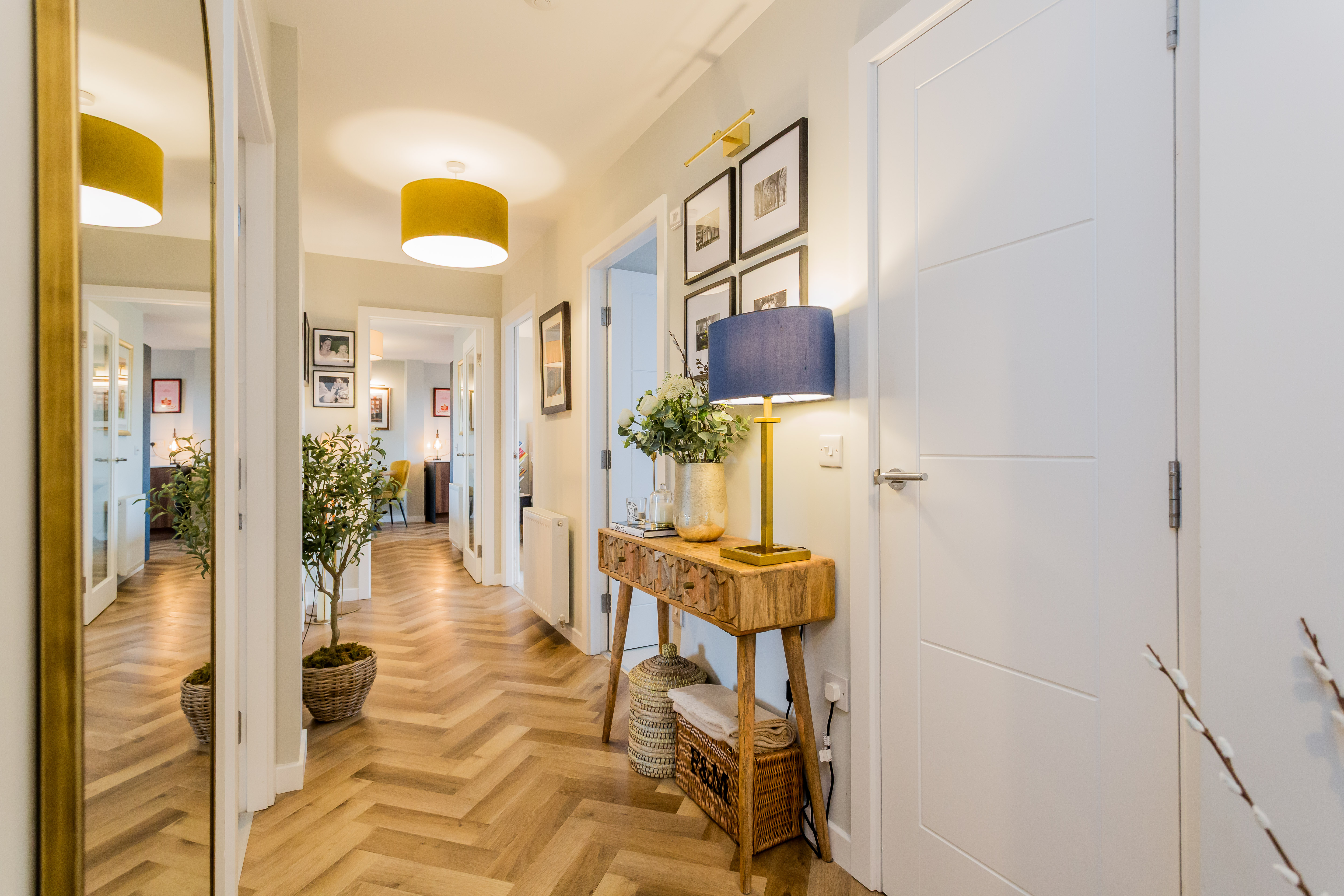 Immediately impressive entrance hallway with herringbone flooring extending to the living area.