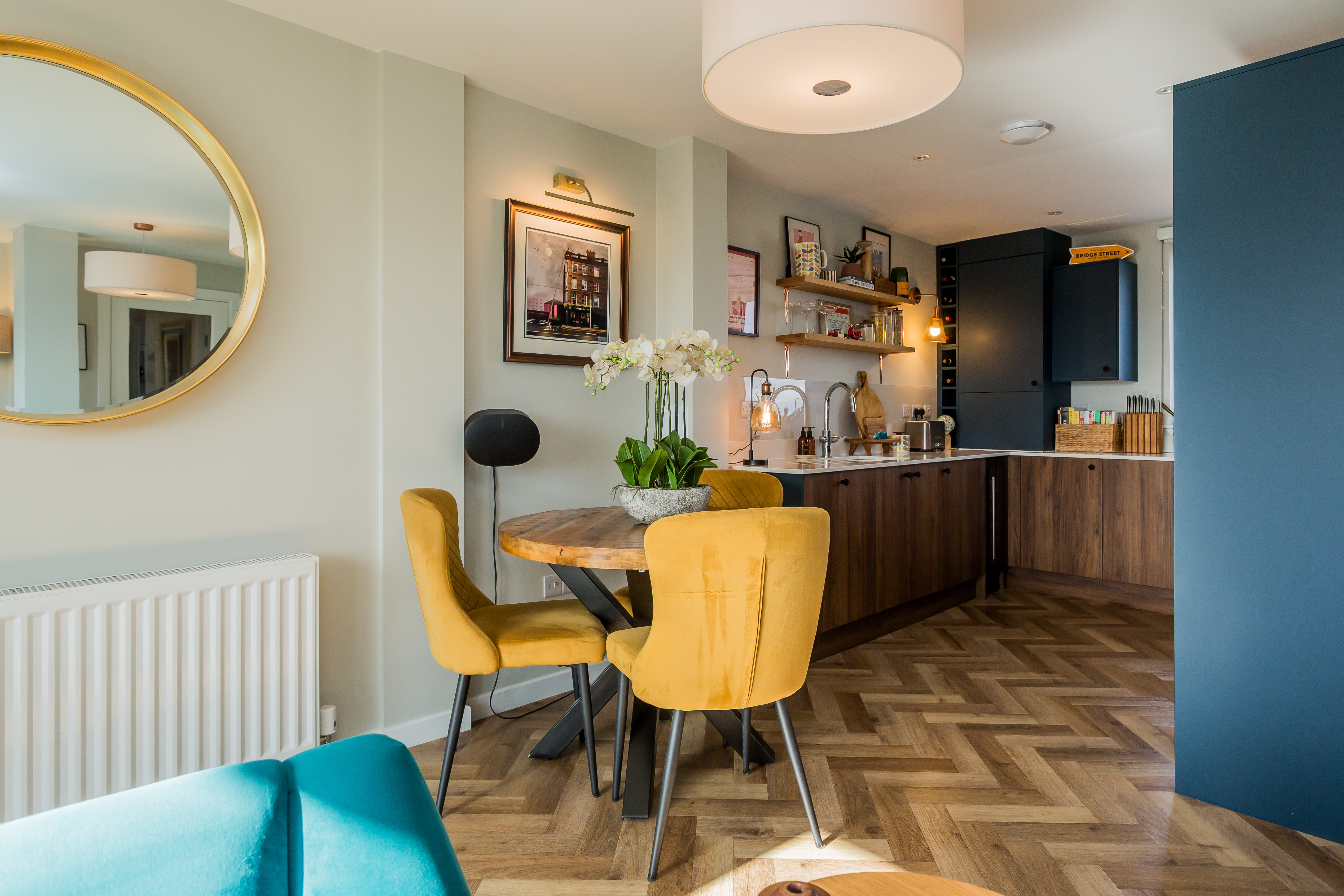 The glass doors provide a beautiful view to The Abbey Mill while thoughtful lighting offers a cosy feel inside.