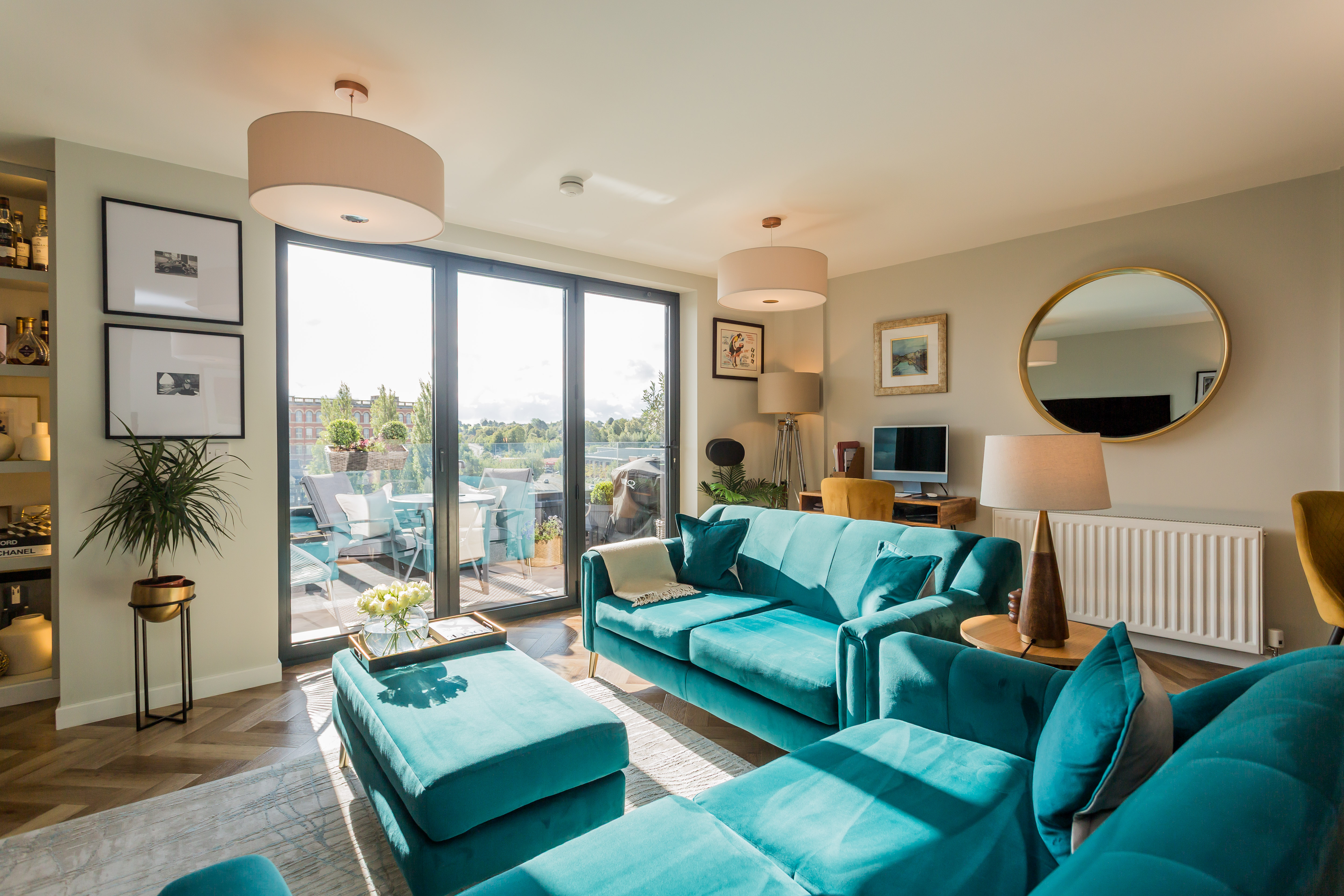 Bright and spacious, open plan living are with bi fold doors opening up to the private balcony.