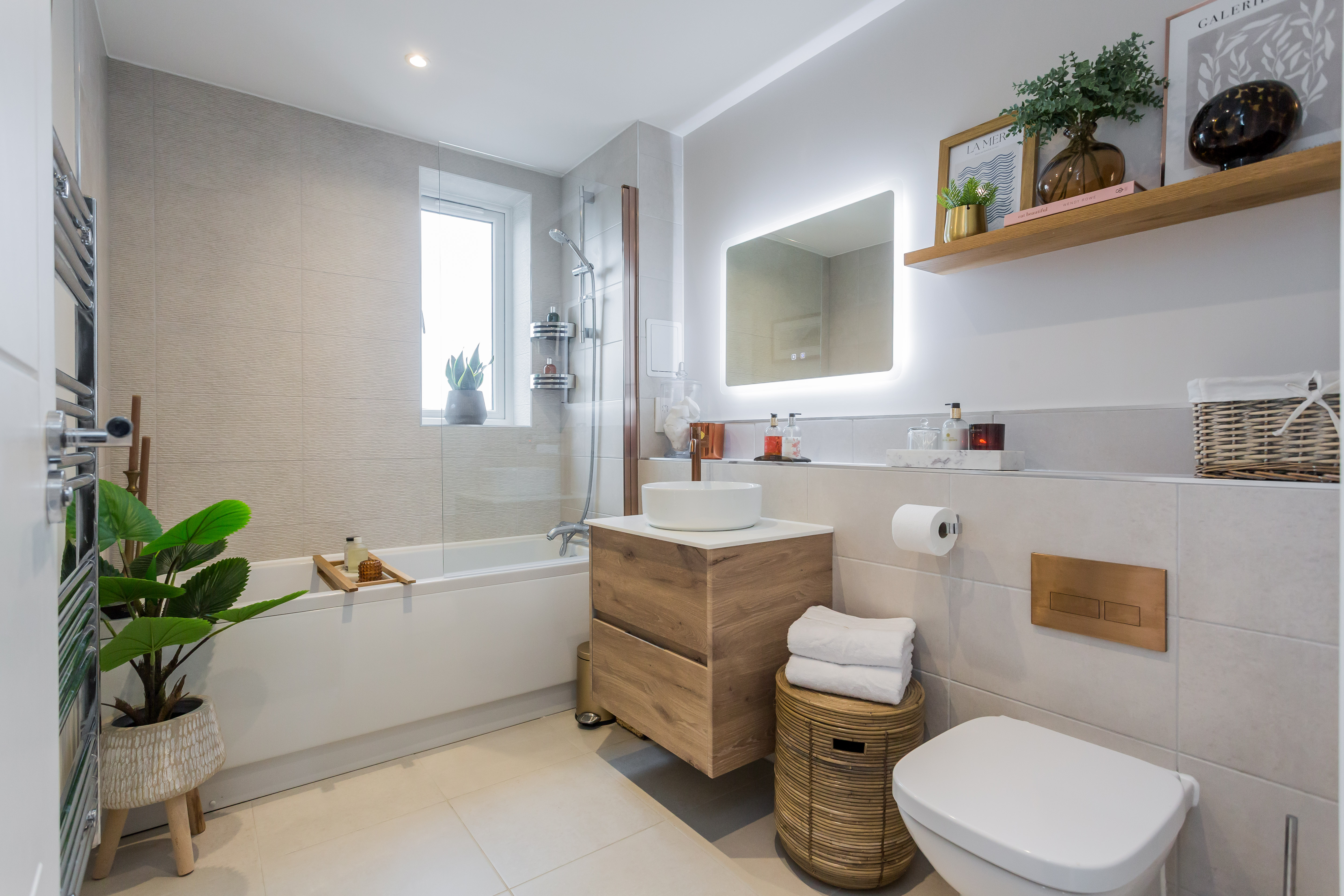 Sumptuous, three piece bathroom with an over the bath shower and illuminated mirror.