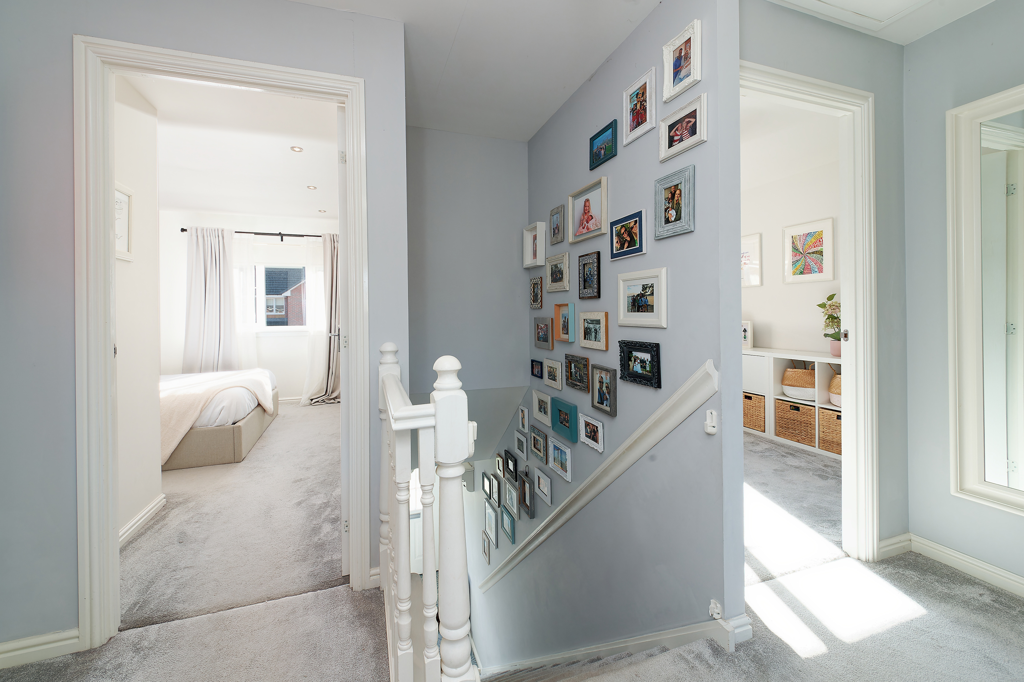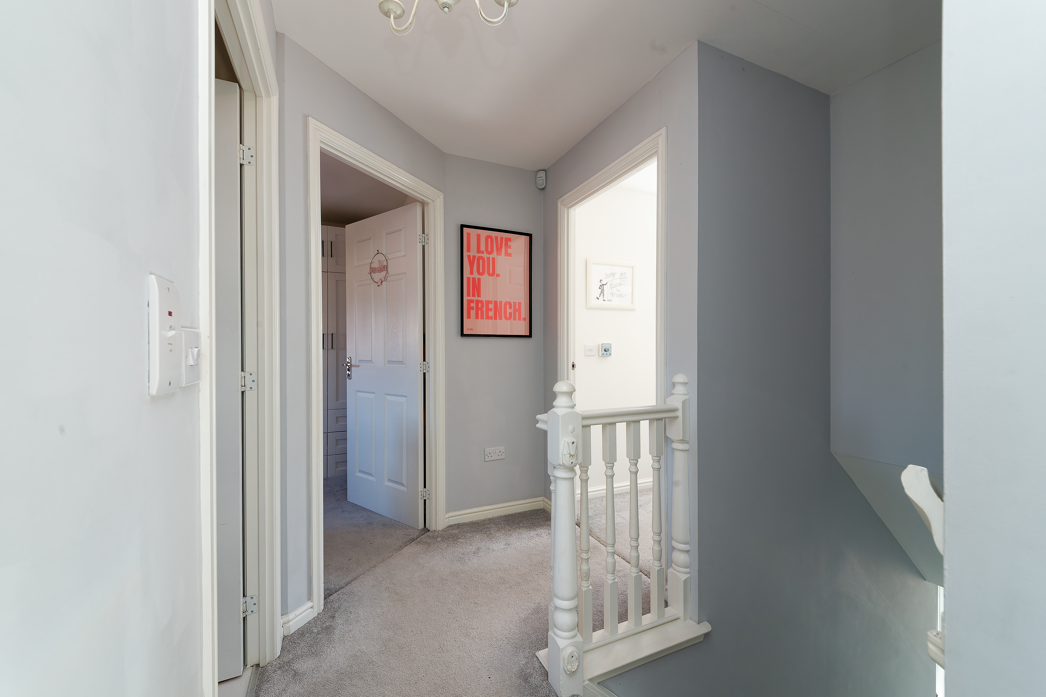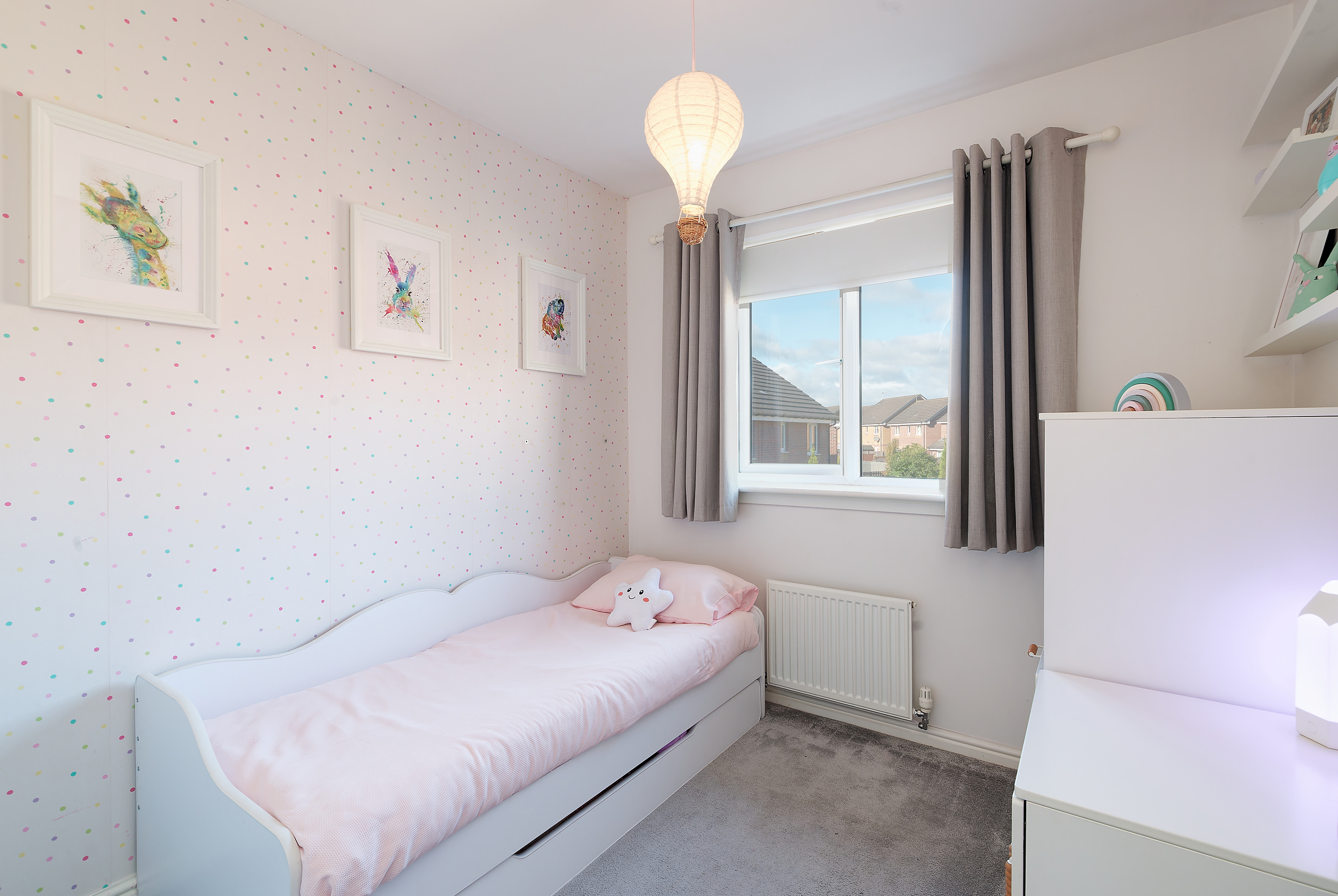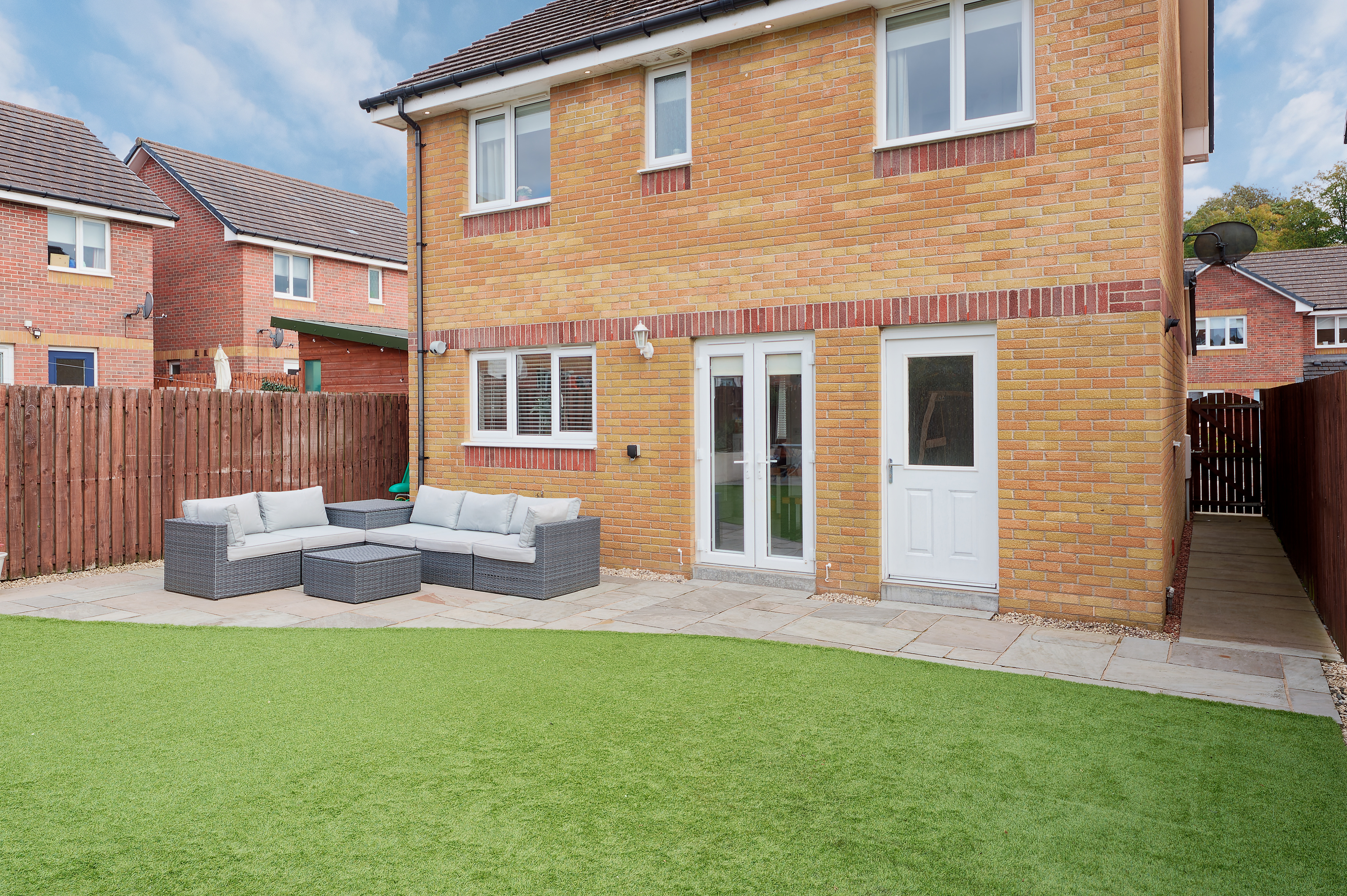 A real plus for this property is that it isn’t overlooked to the rear as it is adjacent residents’ gardens, a rarity in a modern estate. To the front there is a section of lawn with stone chipped driveway leading to the single attached garage. The fabulous rear garden is all enclosed with timber fencing, is level and has artificial grass and a sandstone patio on a south west orientation for alfresco dining.