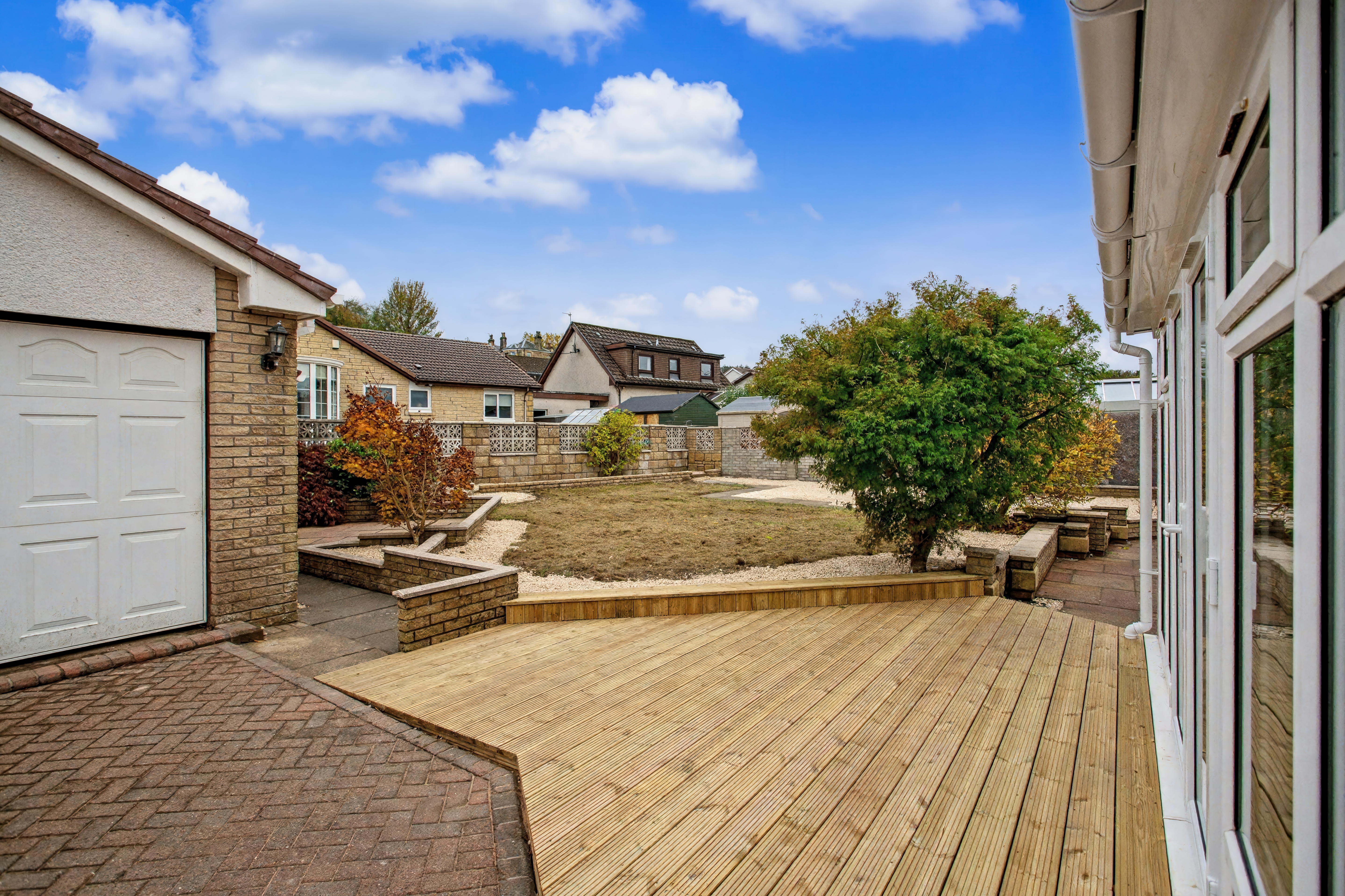 Externally there is a substantial monobloc driveway that leads to a double detached garage. The raised frontage has a mature tree and lawn section bordered by stone chips. The rear garden has a timber deck immediately adjacent to the property, separate patio and central section of lawn, again bordered by stone chips.