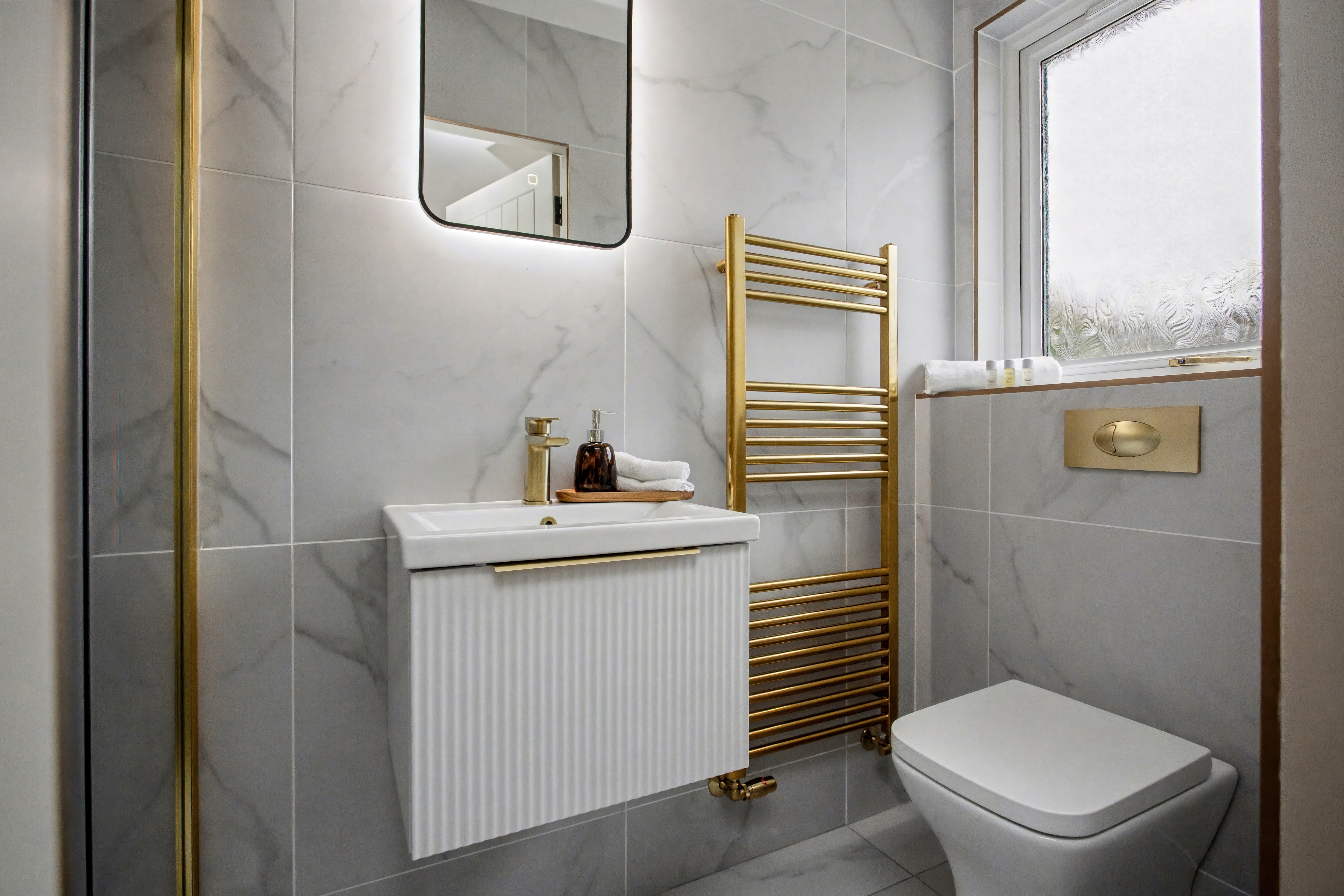 The reception hallway leads to an inner hall where are two separate storage cupboards and access to the house bathroom and bedroom accommodation. The bathroom is fully tiled with bath, separate shower cubicle, WC and wash hand basin. There are three double bedrooms, the principal with en suite shower designed again in a contemporary fashion. Each of the bedrooms benefit from built-in fitted wardrobes.