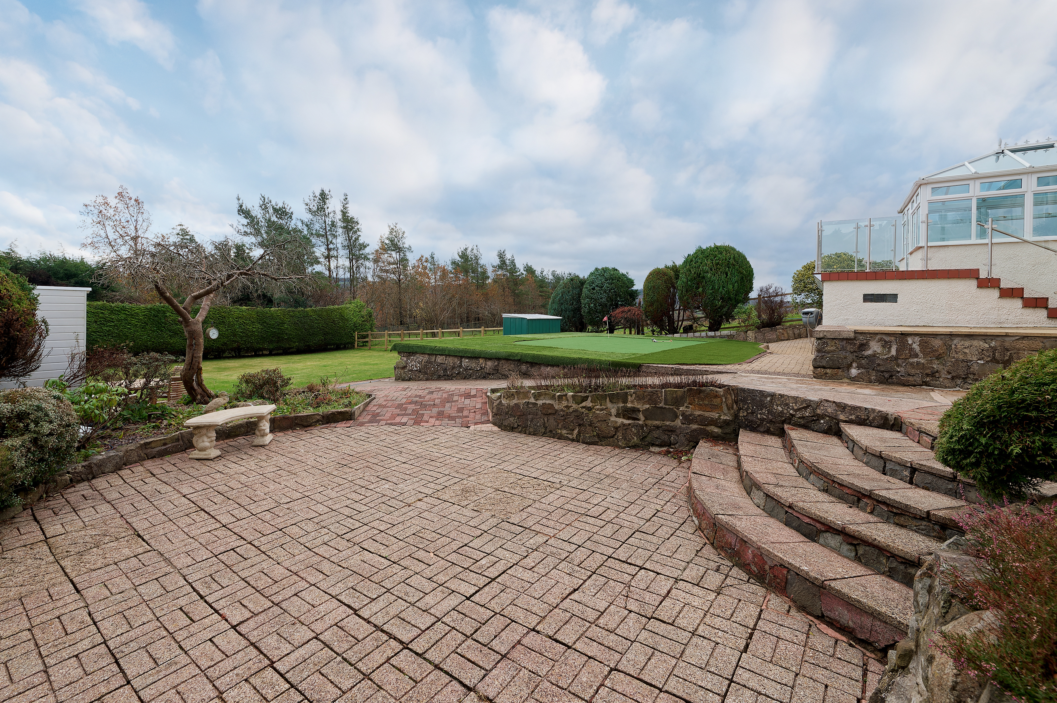The outstanding feature of Roshven is the extensive garden grounds. The gated entrance leads to an extensive monobloc driveway that leads to a double detached garage and car port. To the rear as you step down via the flagstone steps to the side you cannot fail to be impressed as the two-tier garden becomes apparent with its artificial putting green and patio down towards the extensive lawn. There is also a summer house to enjoy the peace and tranquillity the garden enjoys. To the rear of the property cellarage provides further storage which is easily accessible as is a gardeners loo under the conservatory.
