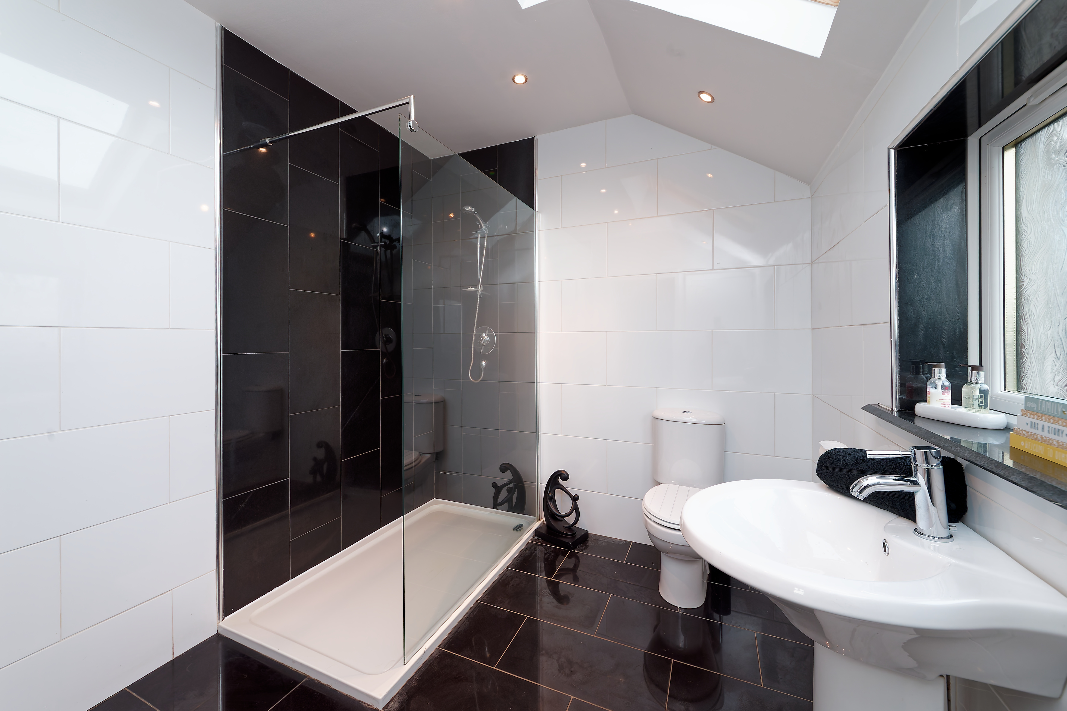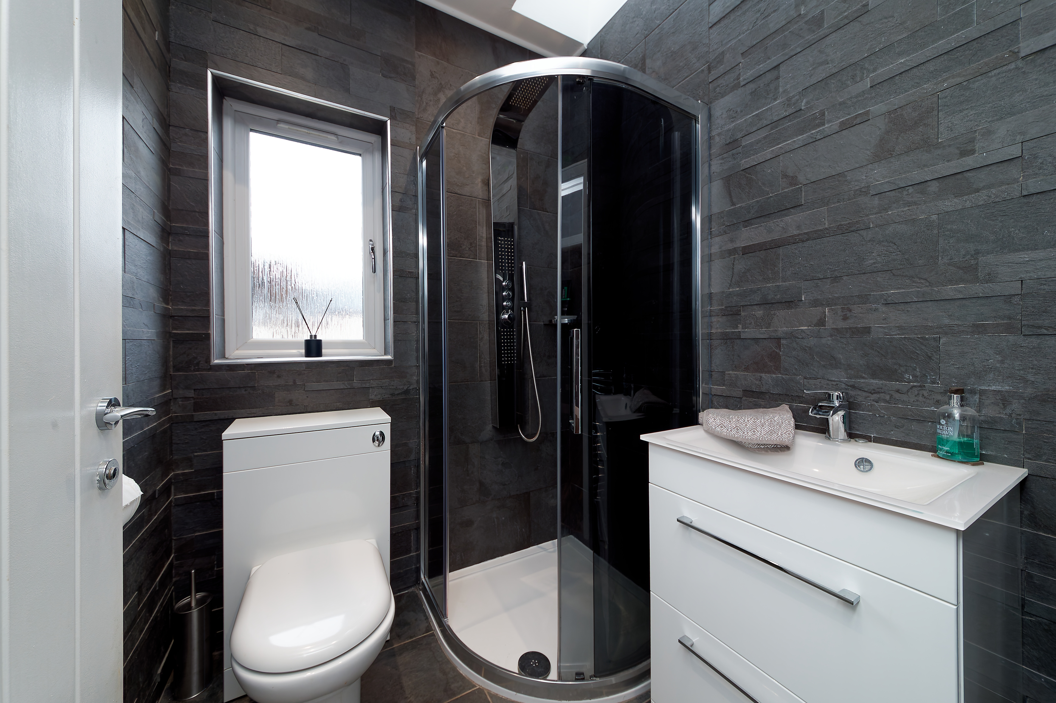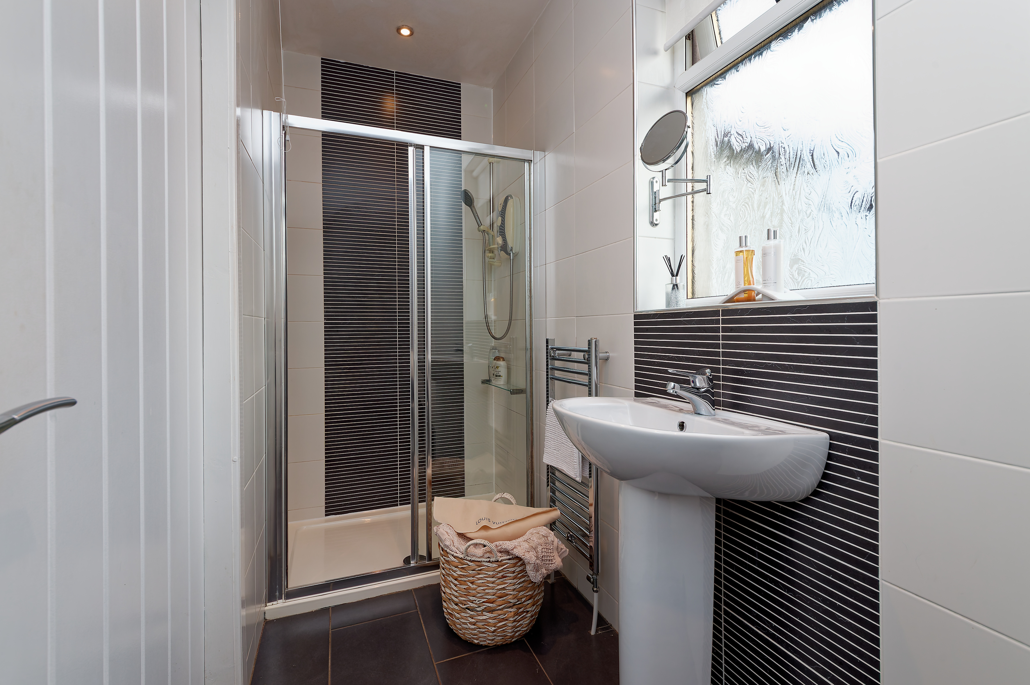 There are three further bedrooms in the main portion of the property, two of which have en-suite bathrooms and built in fitted wardrobes. The house bathroom has contemporary tiling and consists of bath, walk-in shower, WC and wash hand basin. The principal en suite and house bathroom both have electrically operated Velux windows for convenience.