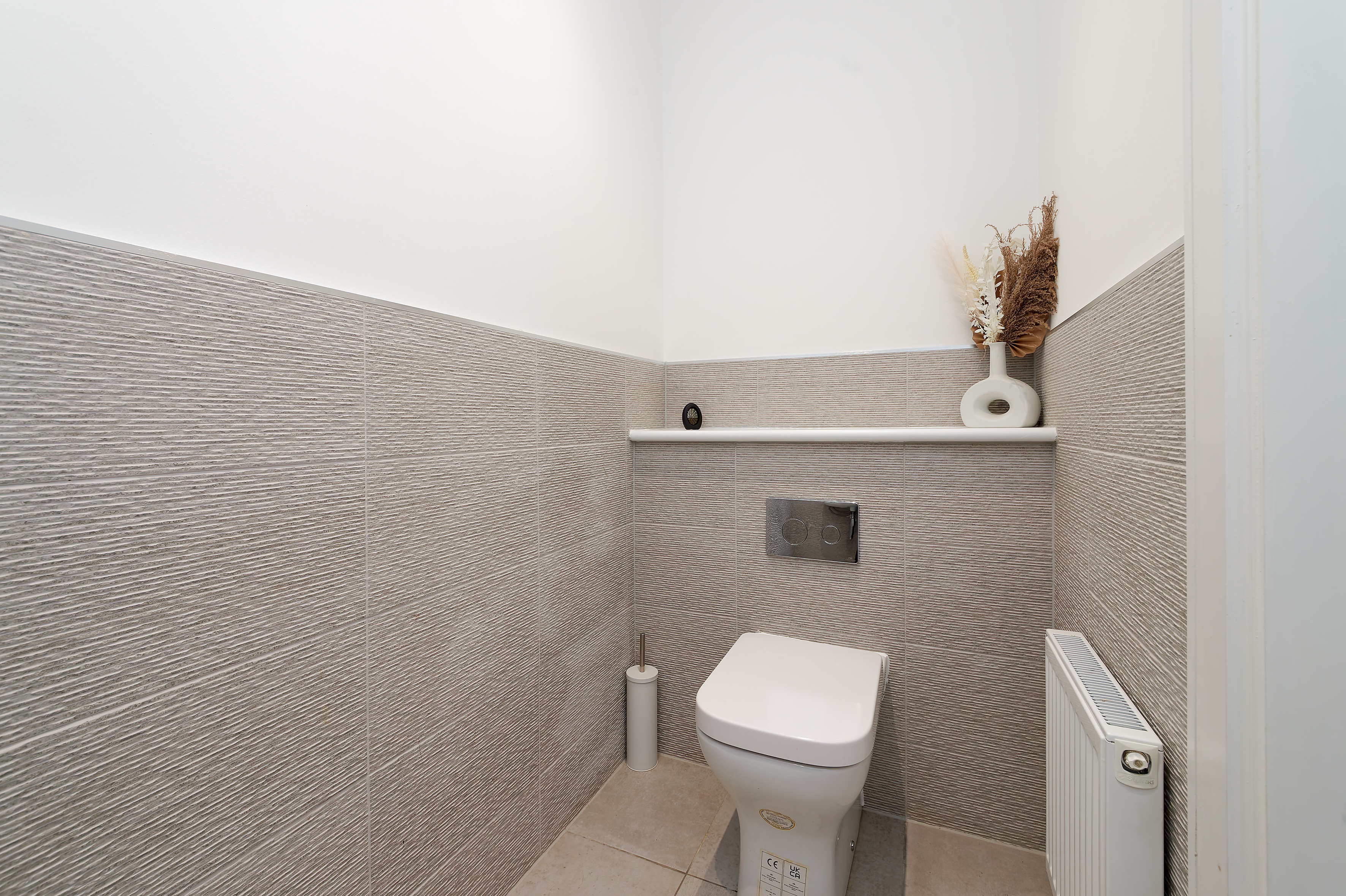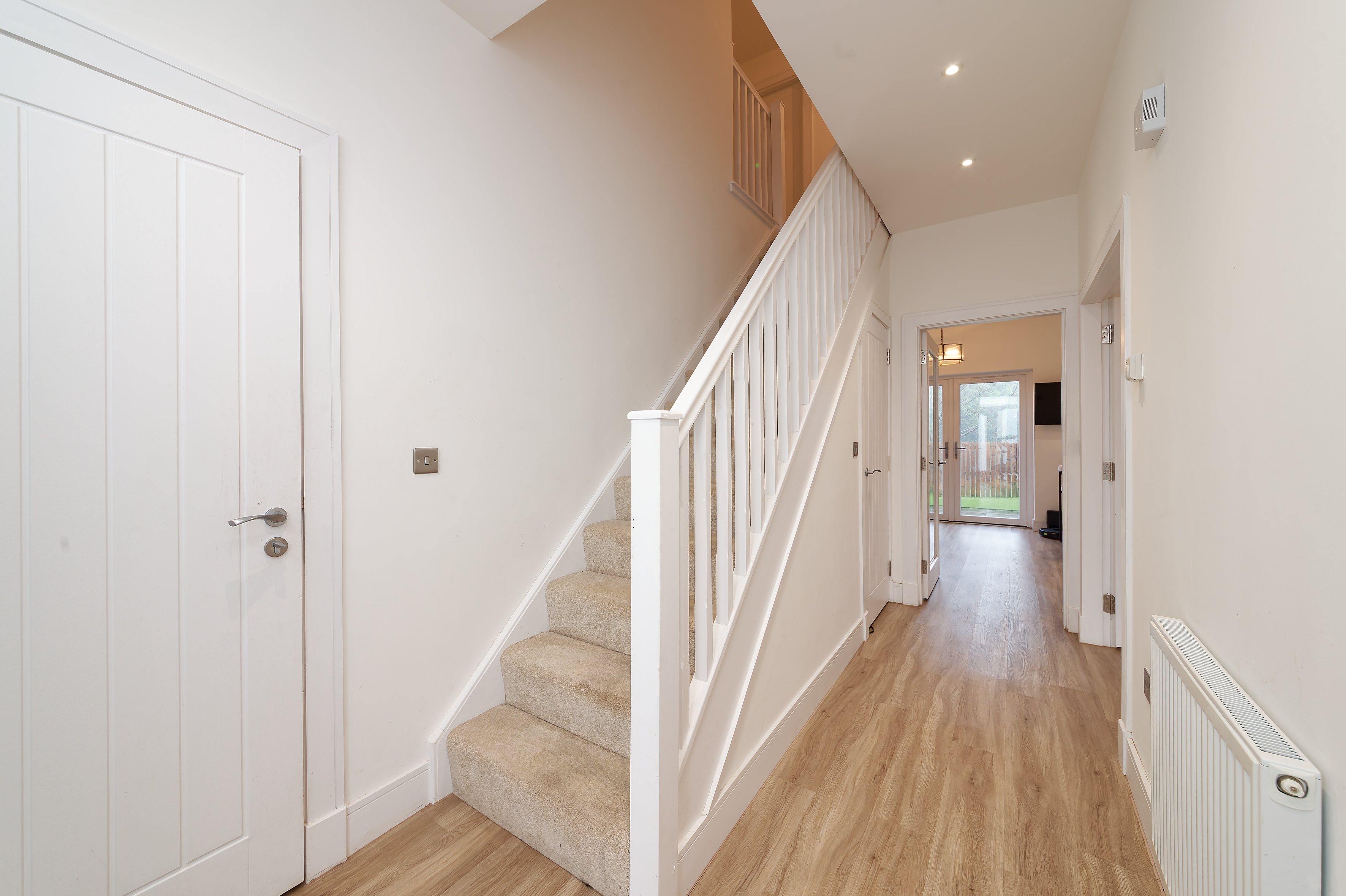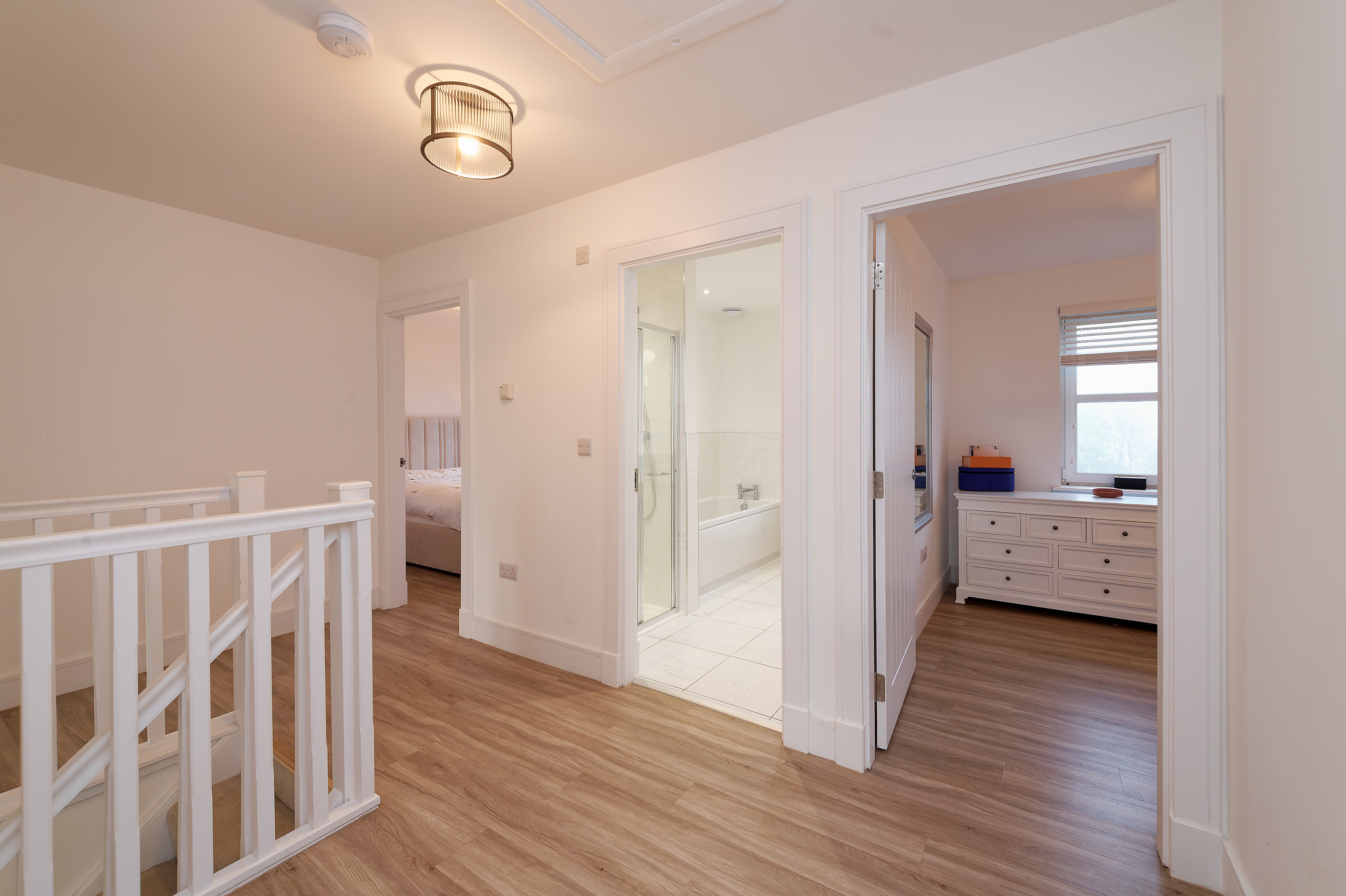 The stairwell with carpet leads to the first floor where there are four double bedrooms and the house bathroom with separate shower cubicle. Each of the bedrooms have built in fitted wardrobes and the principal bedroom has an en-suite shower room.