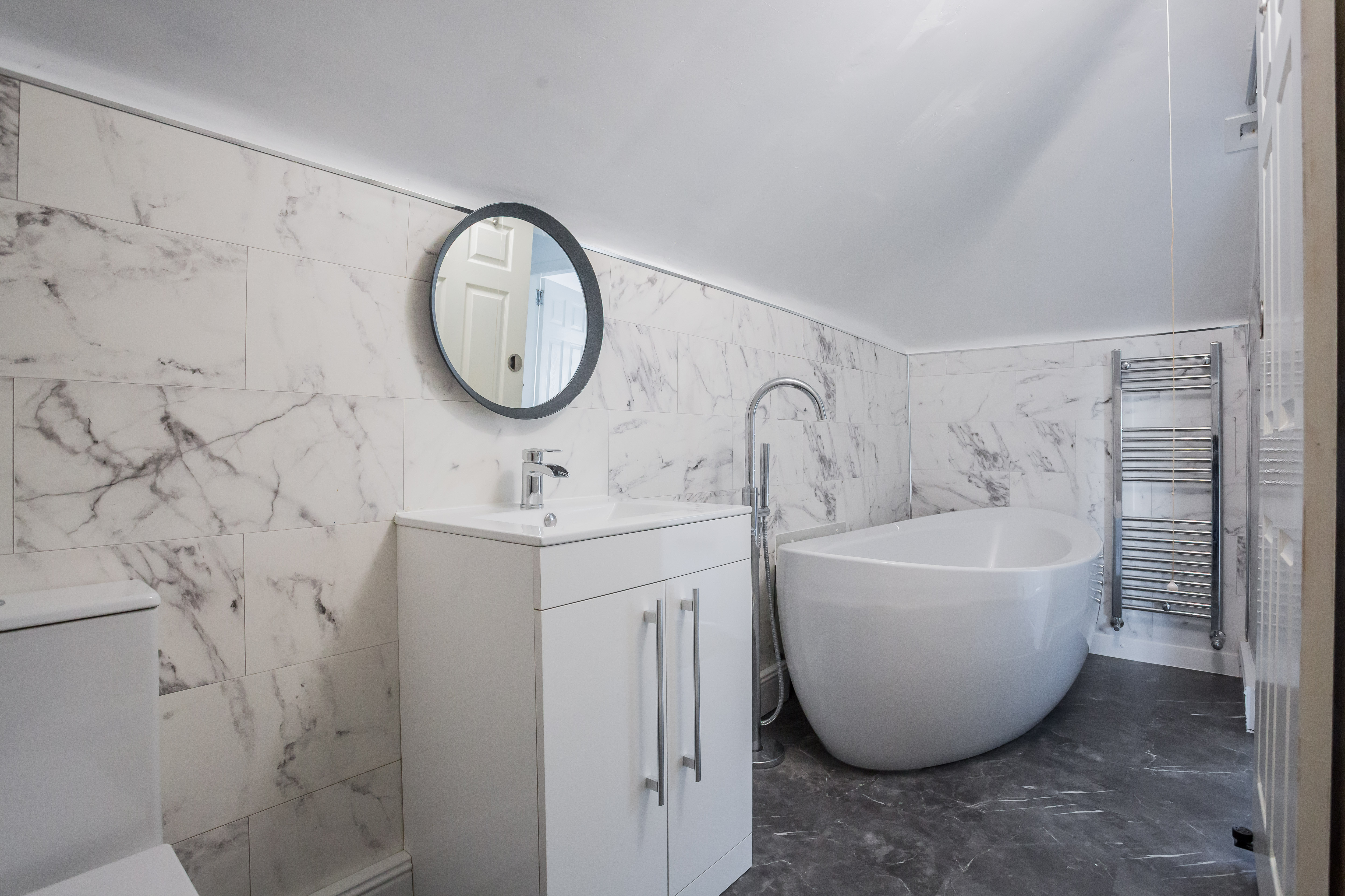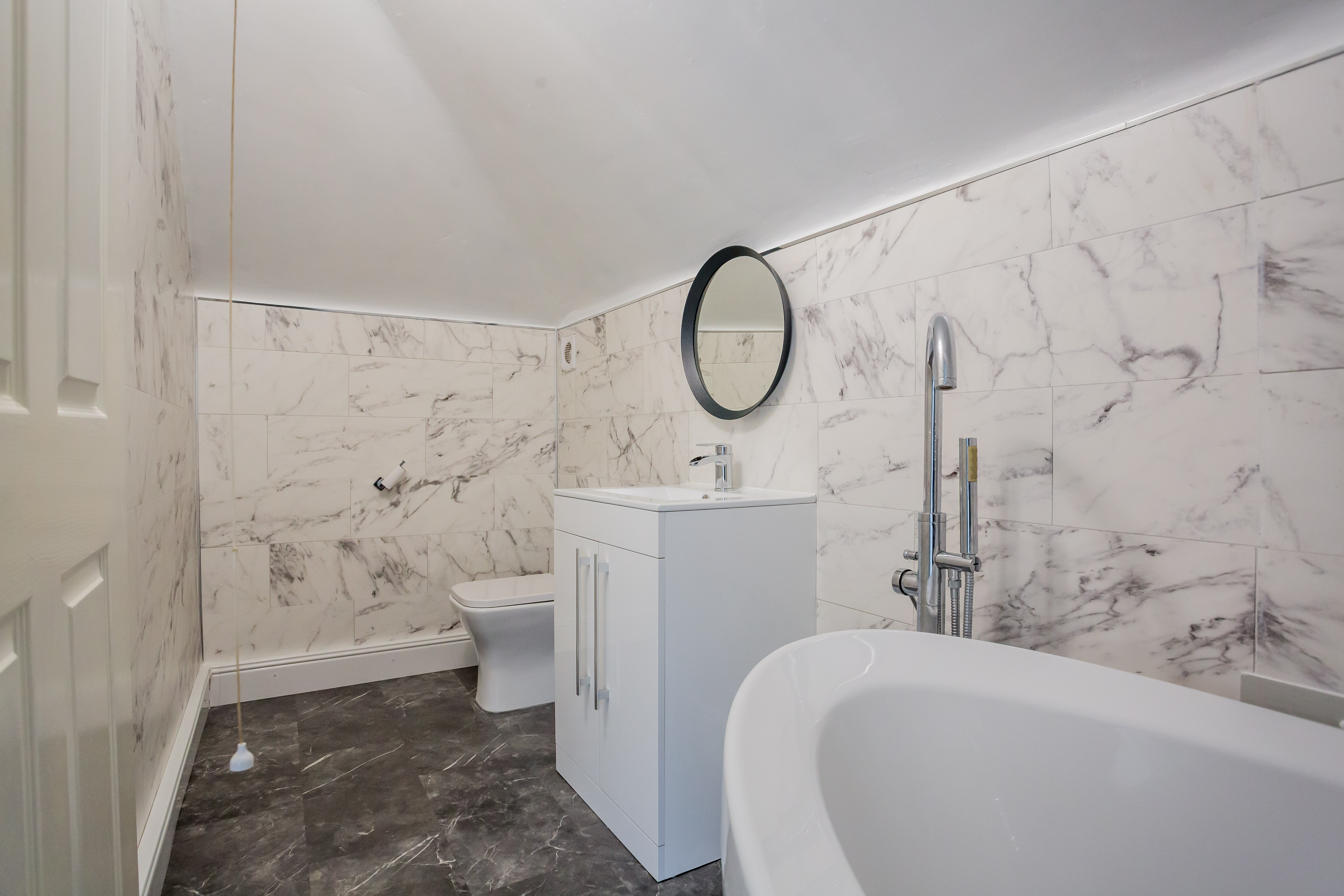 Bathrooms are equally well considered. A sleek three-piece shower room on the ground floor keeps things practical, while upstairs you’ll find a modern three-piece bathroom with a statement free-standing tub — perfect for switching off at the end of the day.