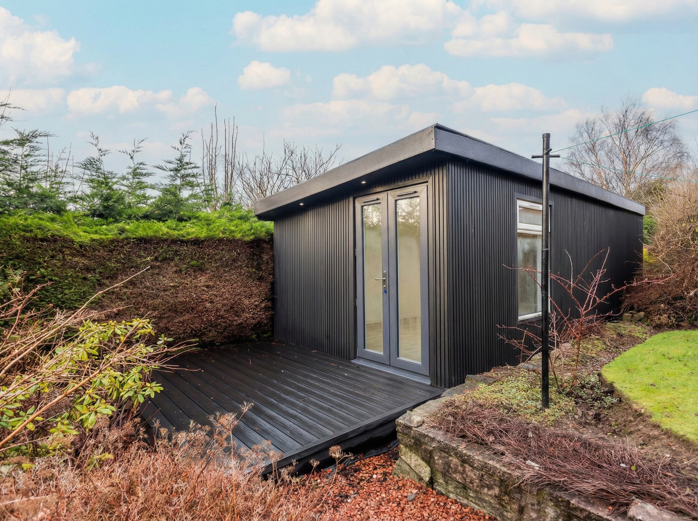 Outside, the south-facing garden is a sun-soaked delight, with a neat lawn and a versatile outbuilding that’s ready to become whatever you fancy: a home bar, gym, spa, studio, or a dedicated kids’ escape zone. The detached garage mirrors the same cladding, tying everything together beautifully — cohesive, considered, and just a little bit special.