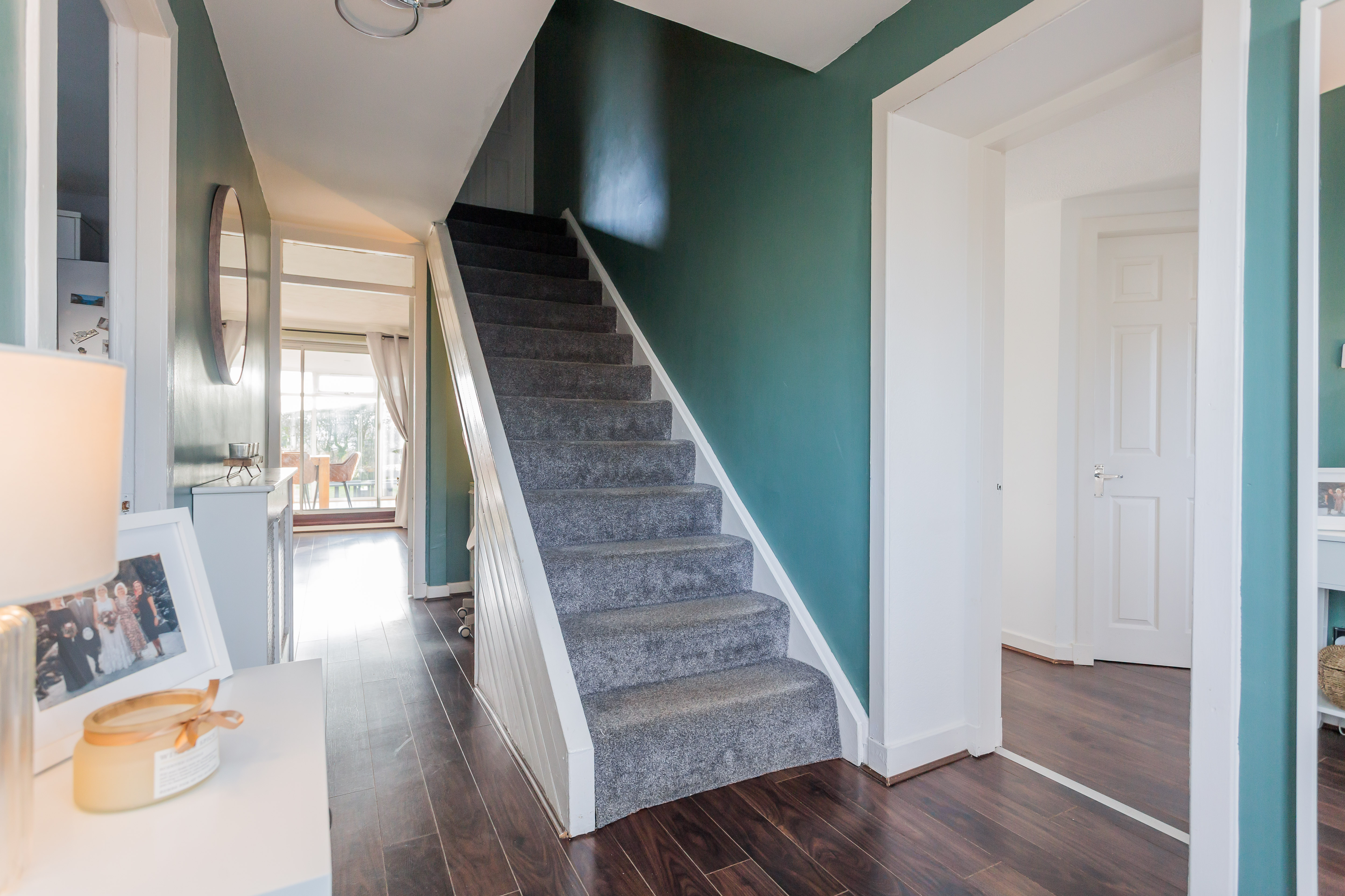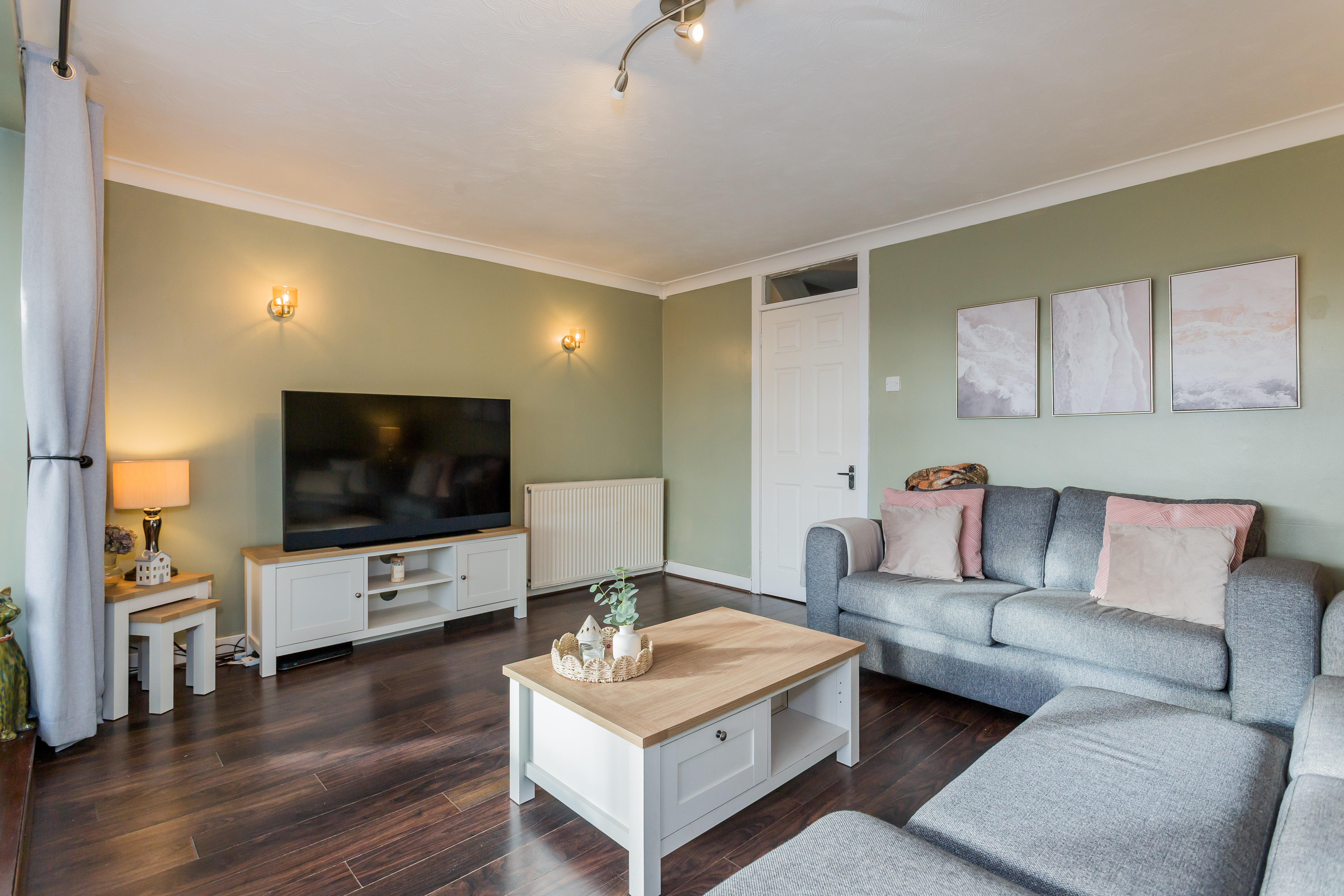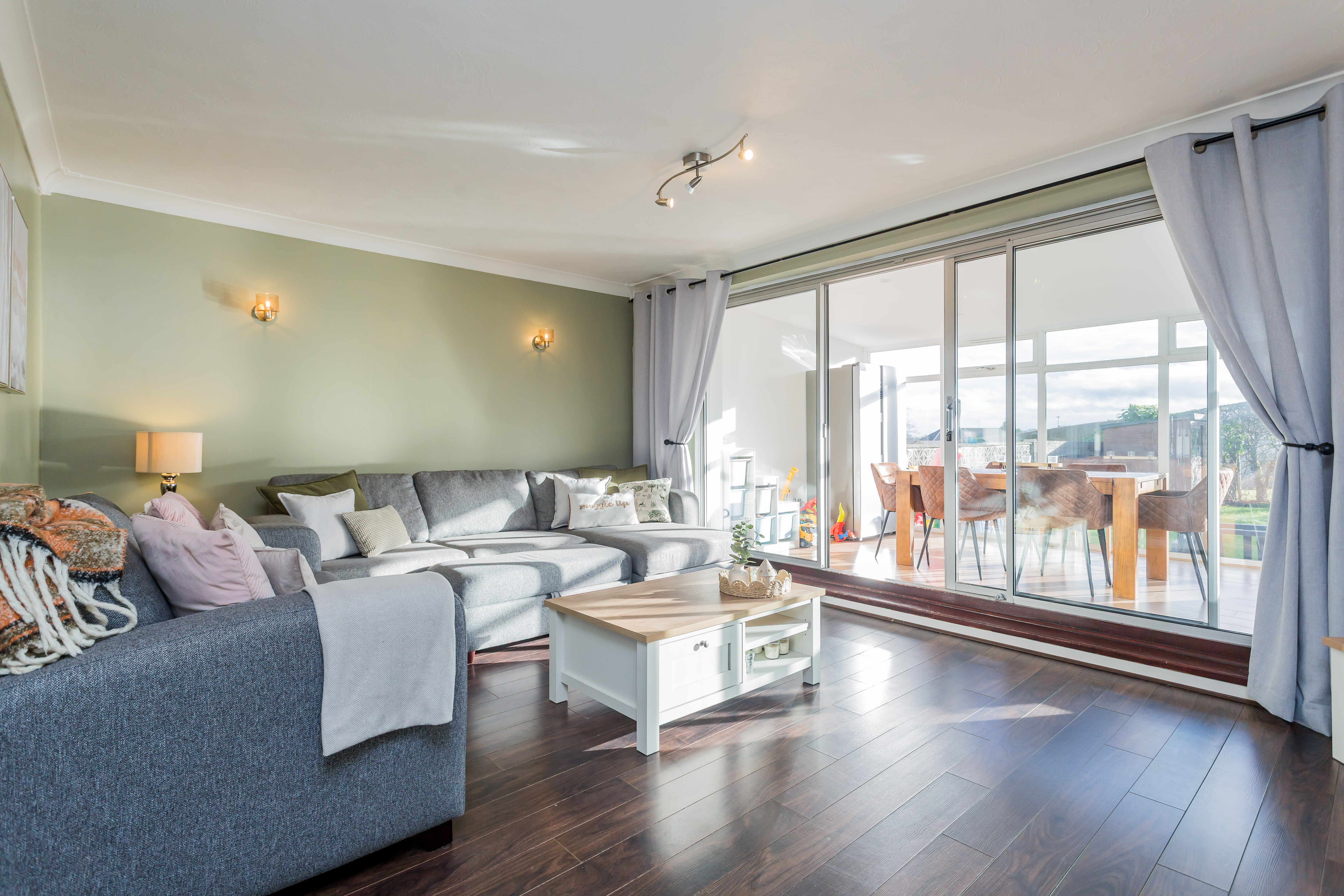 Continuing along the hallway leads to the lounge which again has sliding patio doors that lead this time to a sunroom which in turn leads to the deck and garden.
