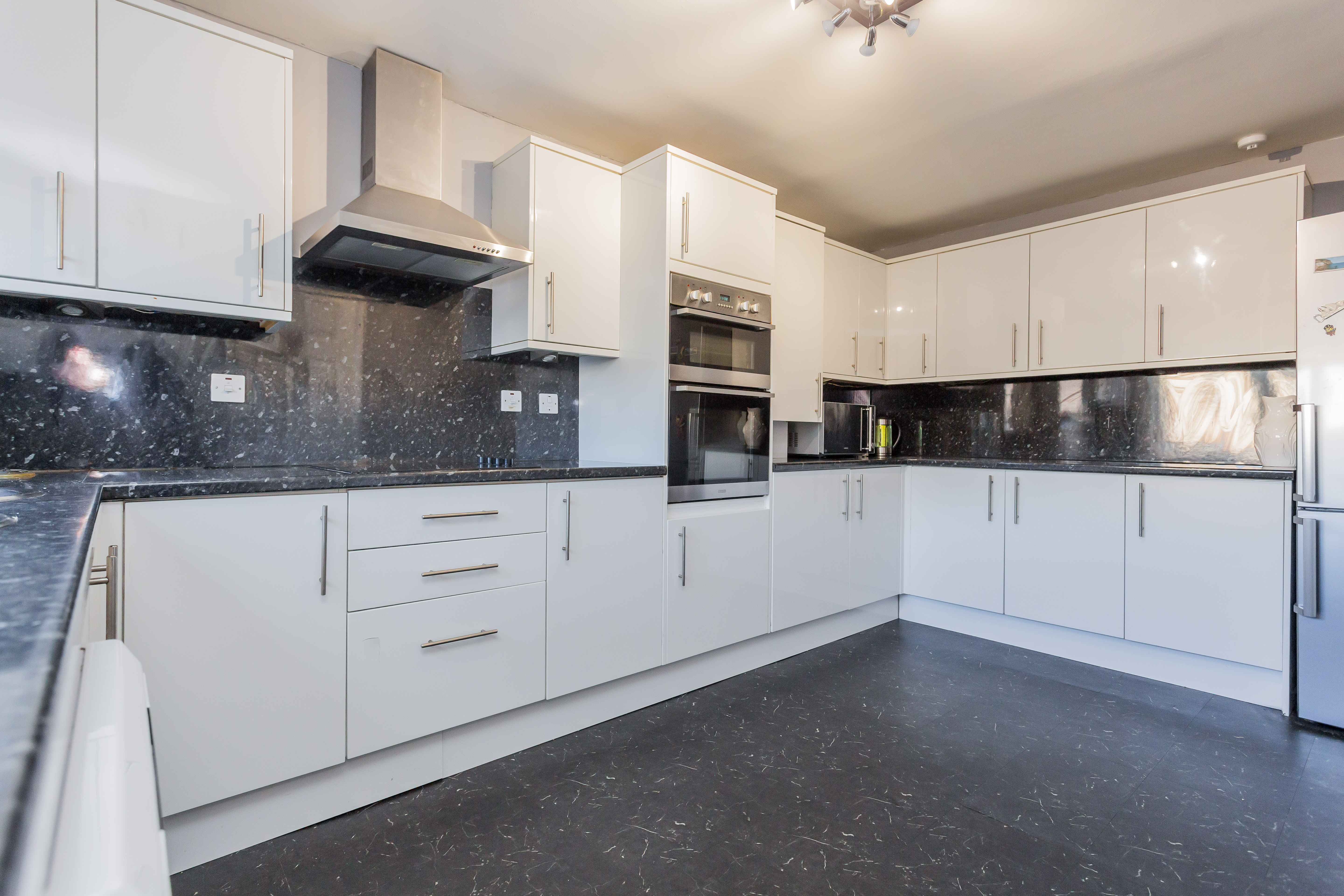 The broad reception hallway leads to the front facing modern high gloss kitchen with integrated appliances that includes oven, hob and extractor hood. Also to the front but extending to the rear is a ground floor bedroom with walk-in wardrobe, en-suite shower room and a set of sliding patio doors that lead directly to the timber deck and garden.