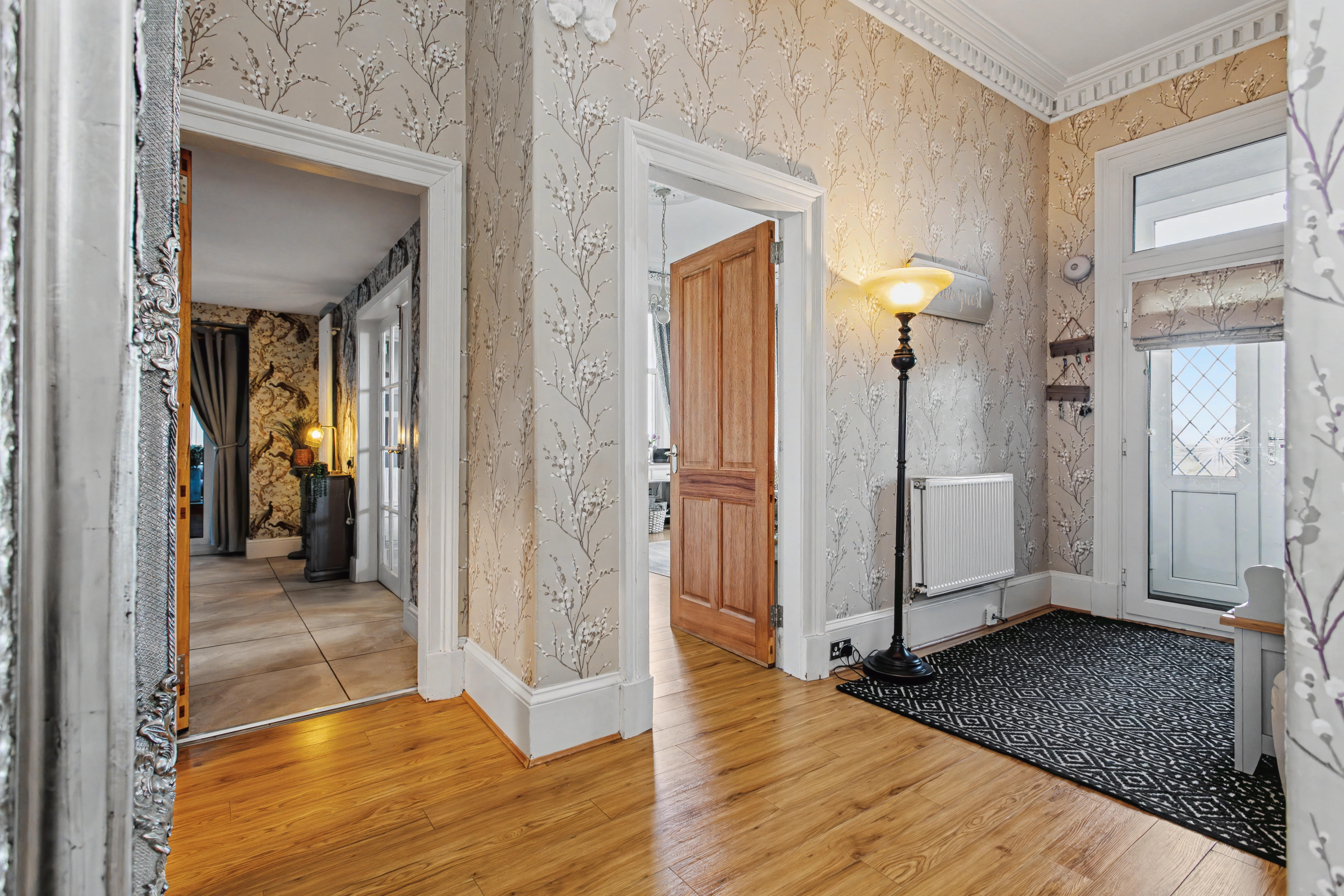 Empathetically upgraded throughout, the property retains fabulous period features immediately present as you enter the broad reception hallway from the vestibule. The original section of the property has lovely symmetry with two bay window rooms to the front; one is the principal bedroom with double aspect, and the other is the formal lounge. An inner hallway from the lounge has floor to ceiling windows and leads to a multi-purpose room that could be a large study or sitting room with a separate entrance externally as well as a cloakroom with WC wash hand basin. The third double-bedroom is off this area and completes the extension.