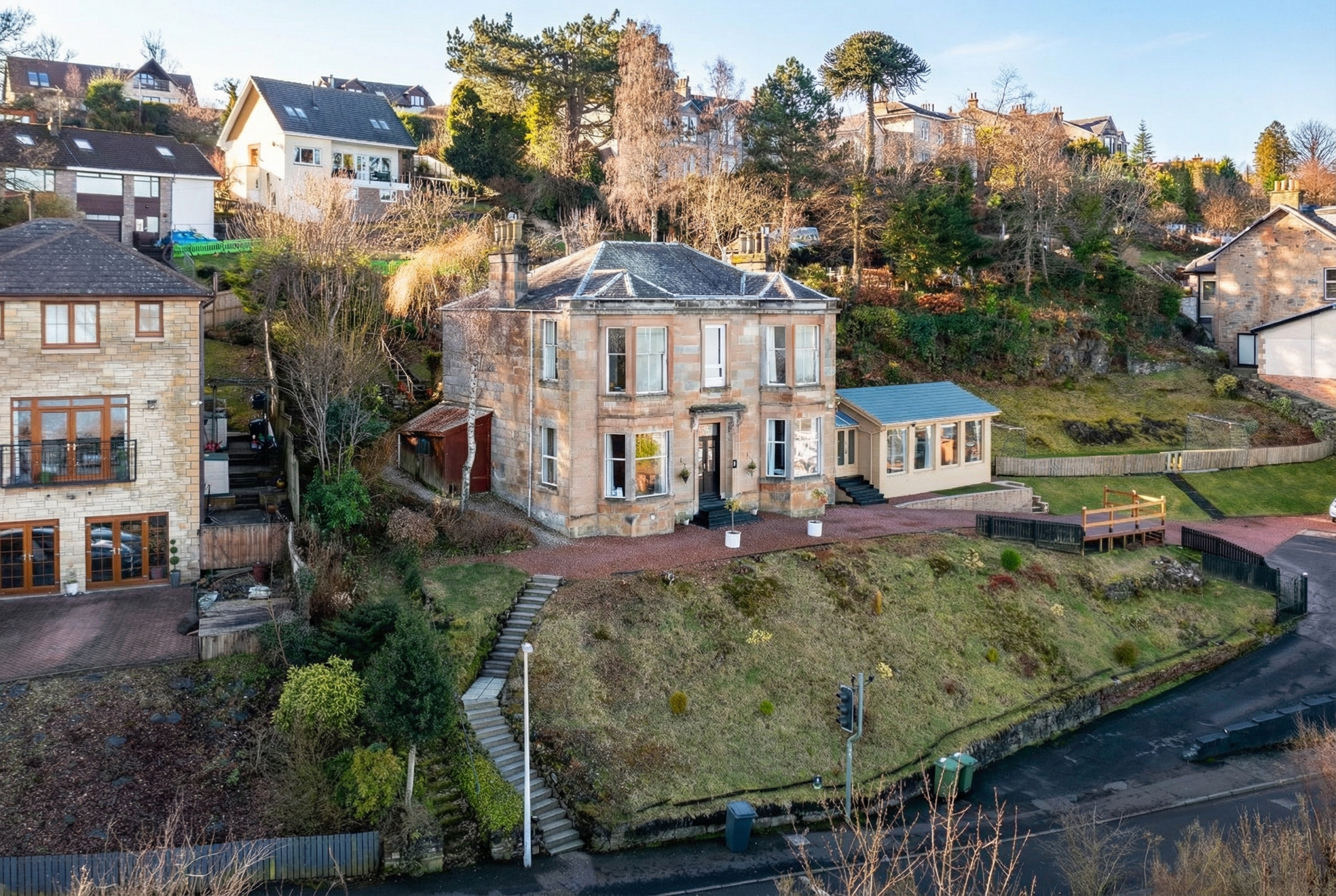 Situated directly opposite the River Clyde is this sandstone lower villa architecturally extended and re-designed to create a beautiful contemporary home set in an elevated position in the much-admired village of Langbank.