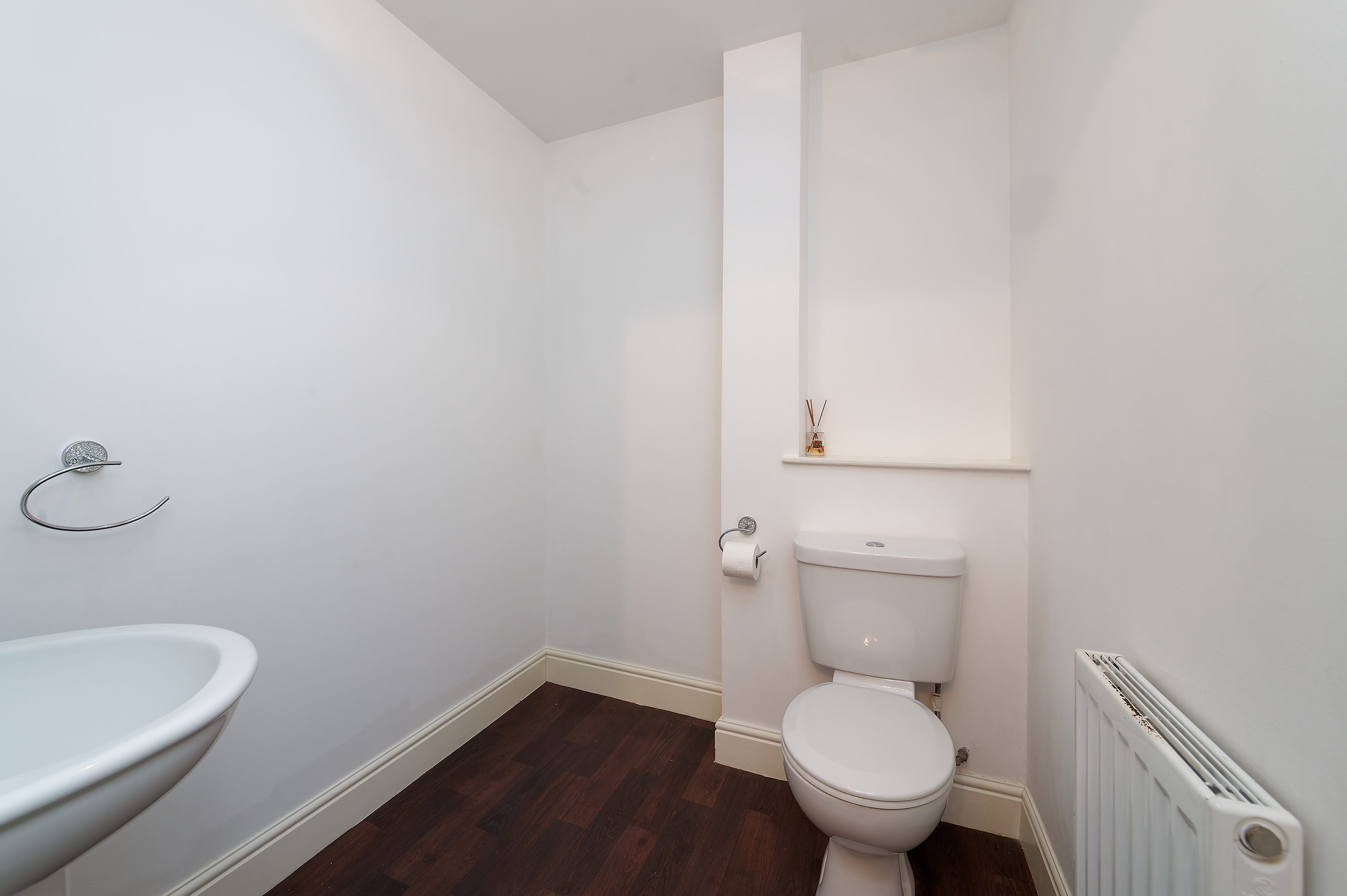A welcoming reception hallway provides access to the front-facing lounge and the impressive dining kitchen. The kitchen is fitted with contemporary wall and base units and benefits from integrated appliances including oven, hob and extractor hood. French doors open directly onto the enclosed rear garden, creating an ideal space for both everyday living and entertaining. A convenient cloakroom WC is located off the hallway.