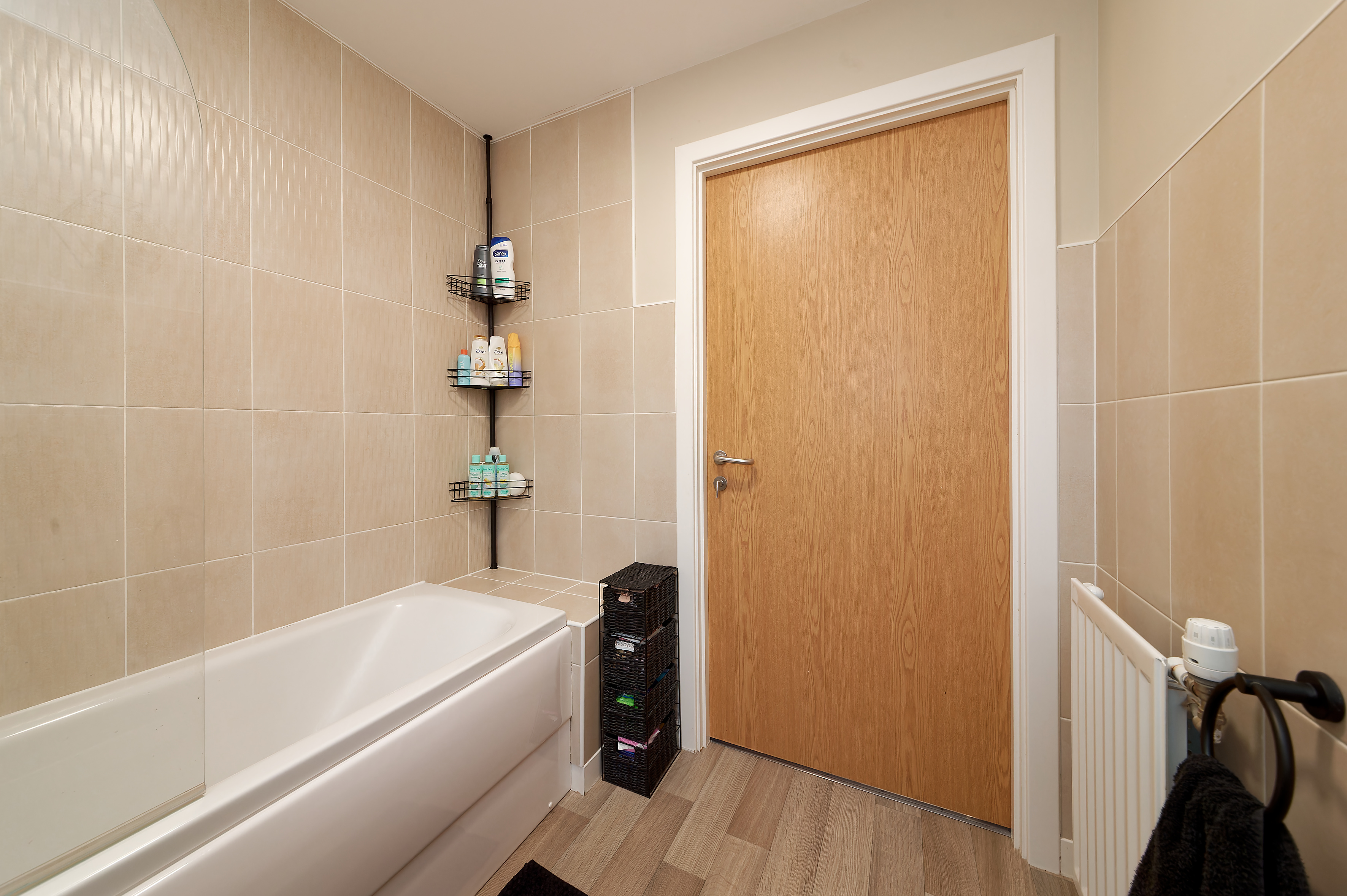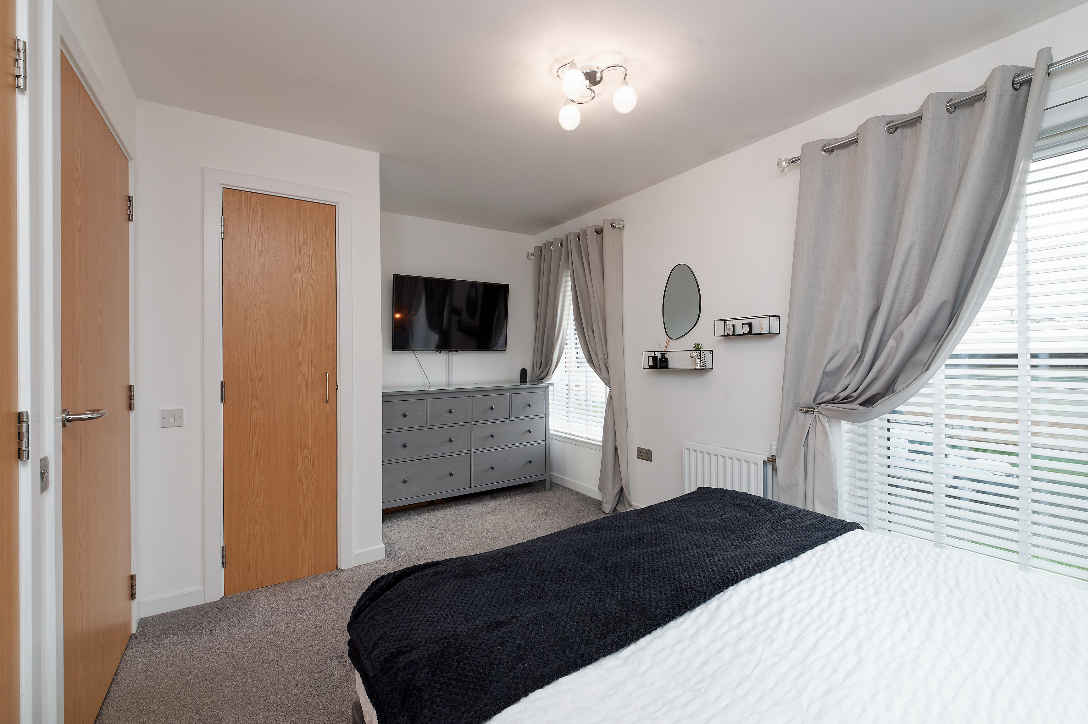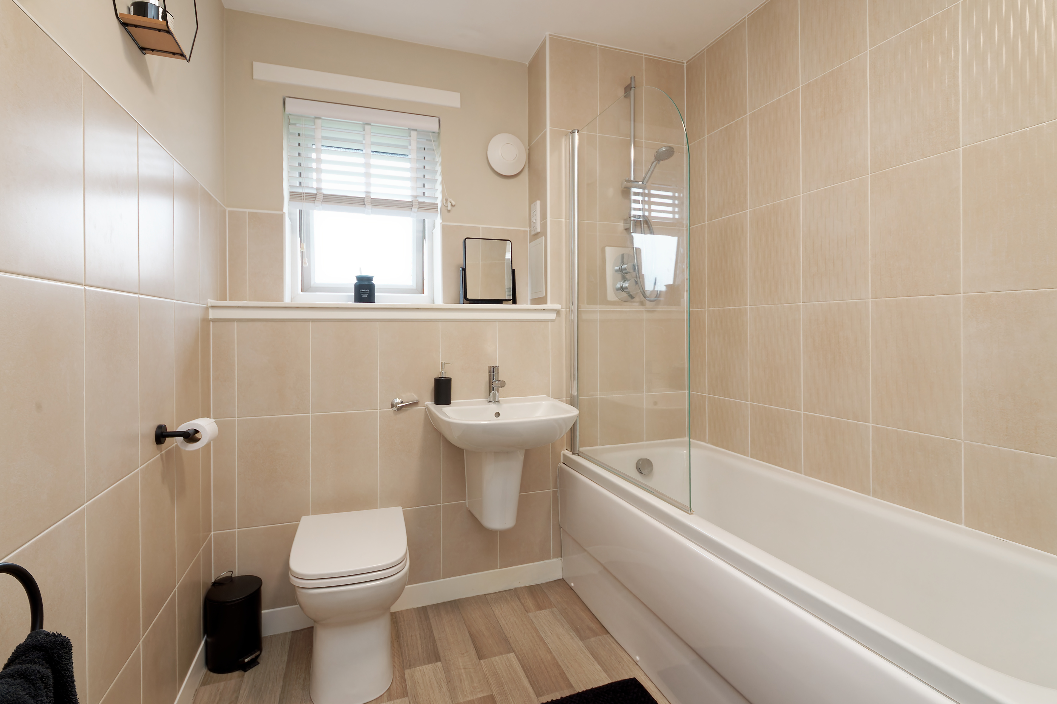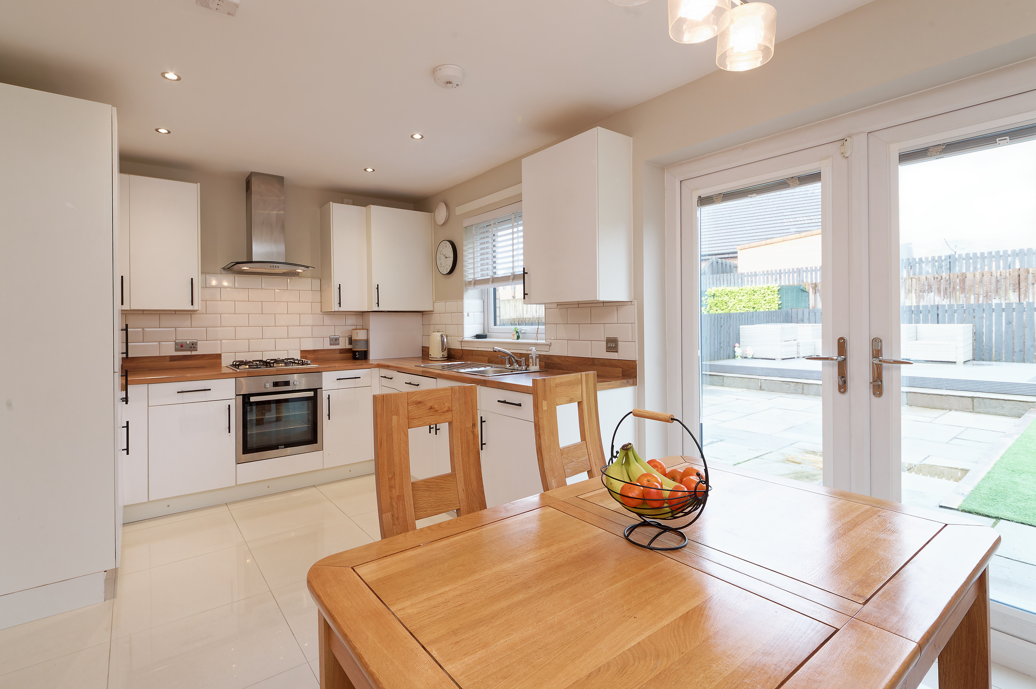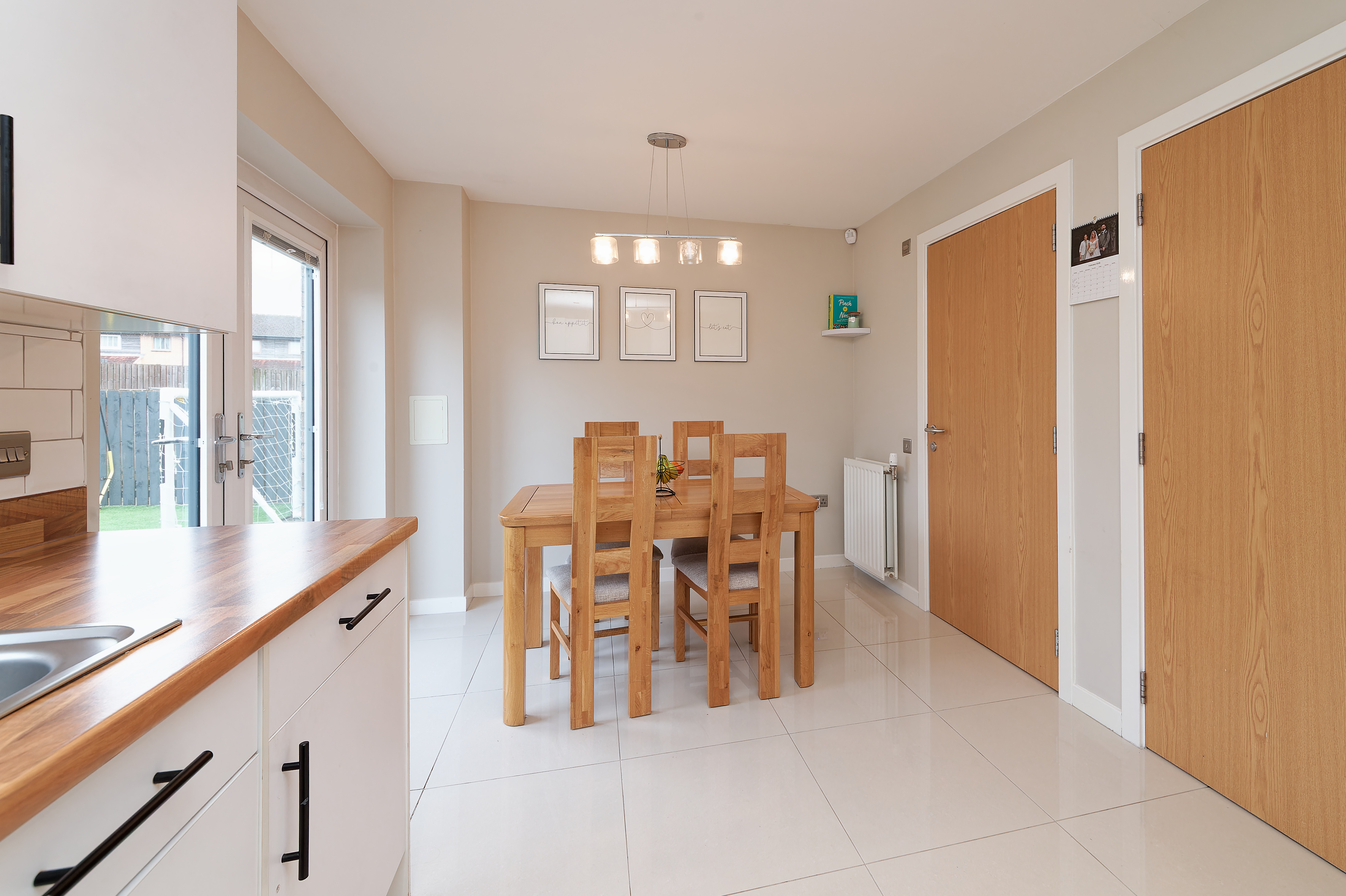 The lounge is front facing and has access to the dining kitchen at the rear that benefits from high gloss wall & base units with integrated appliances including oven, hob and extractor hood. Off the kitchen is a cloakroom with WC and wash hand basin and further storage cupboard.
