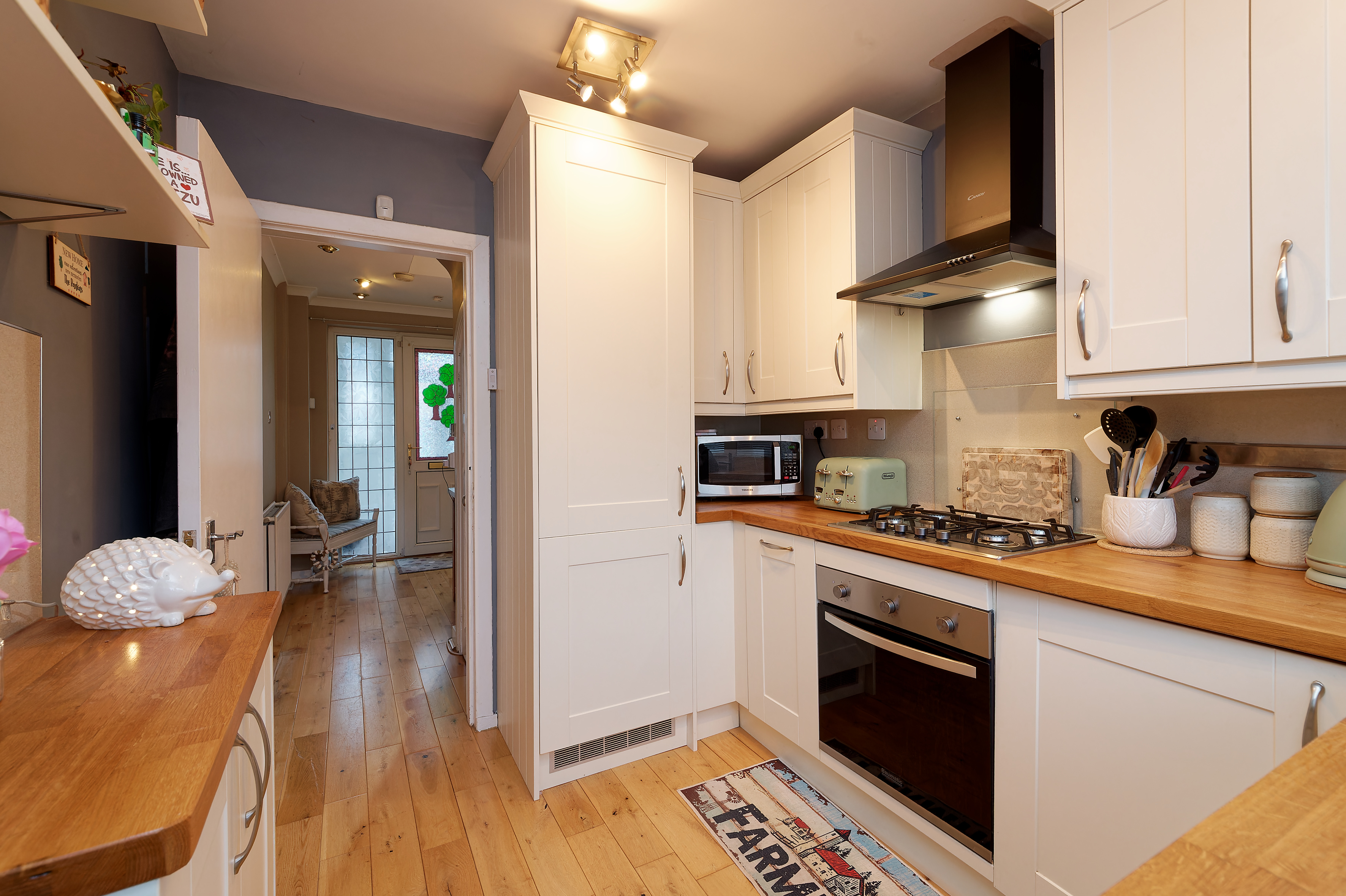 An entrance vestibule with sliding Upvc doors leads to the very inviting reception hallway. The lounge is to the rear and is open plan with a bay window dining room. The modern kitchen has hardwood work surface and integrated appliances that includes oven, hob, extractor hood, fridge freezer, washing machine and slimline dishwasher. A Upvc door leads to the rear garden.