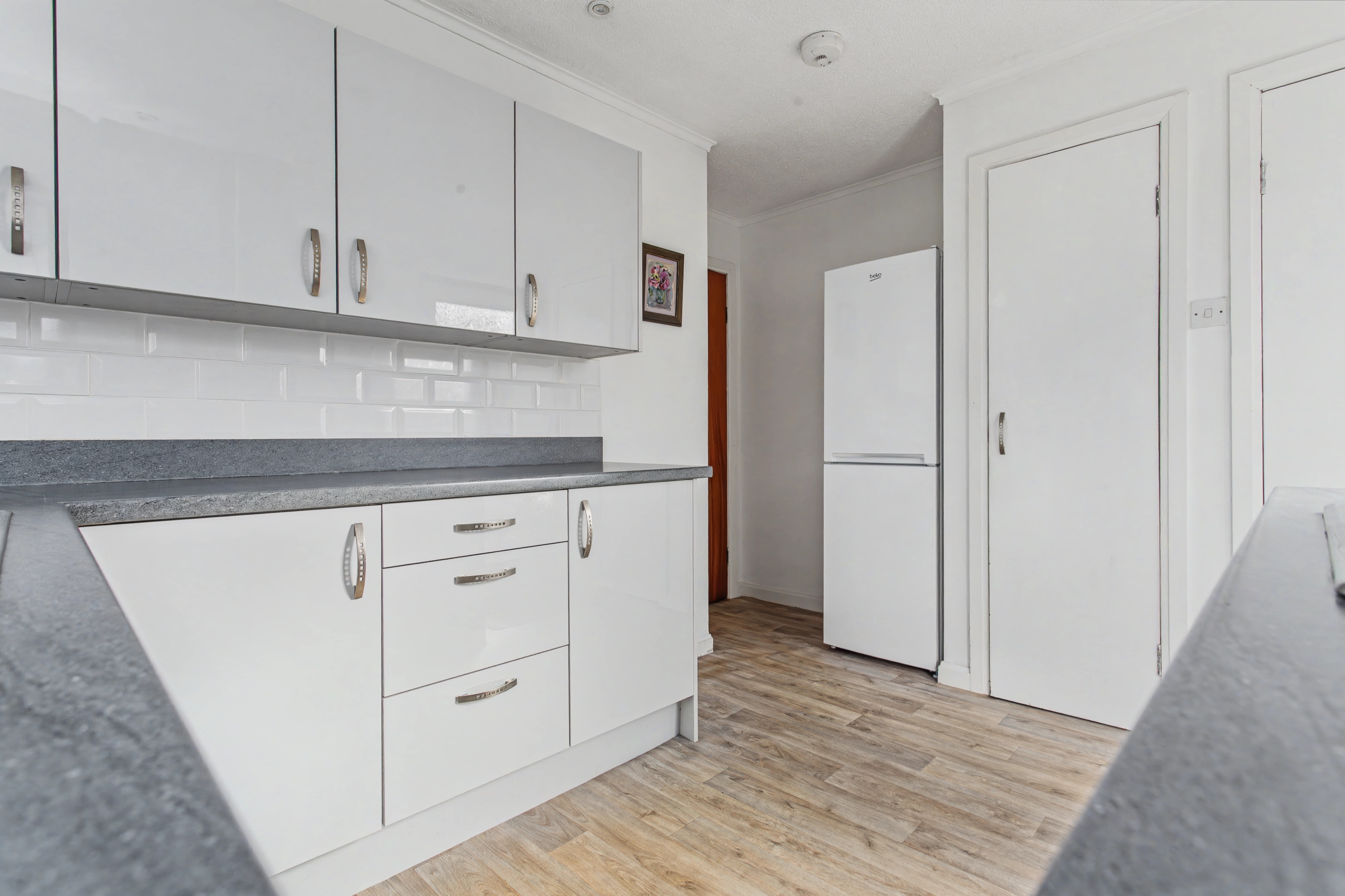 The all on the level accommodation comprises; a broad reception hallway with ample storage cupboards, front facing lounge, modern kitchen with high gloss wall & base units and integrated appliances that include oven, hob and extractor hood. There is also two separate storage cupboards and a glass door leading to the side elevation.