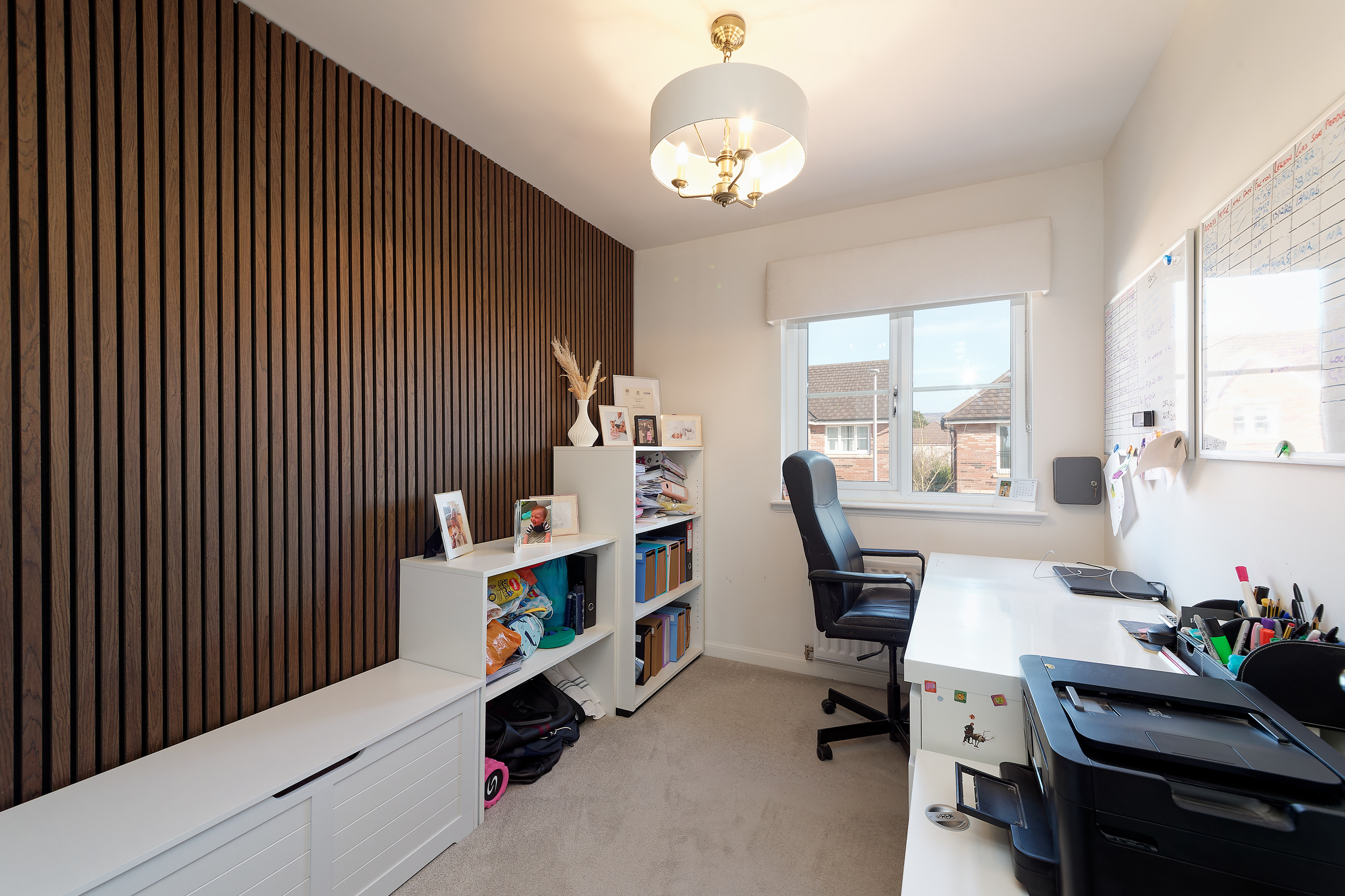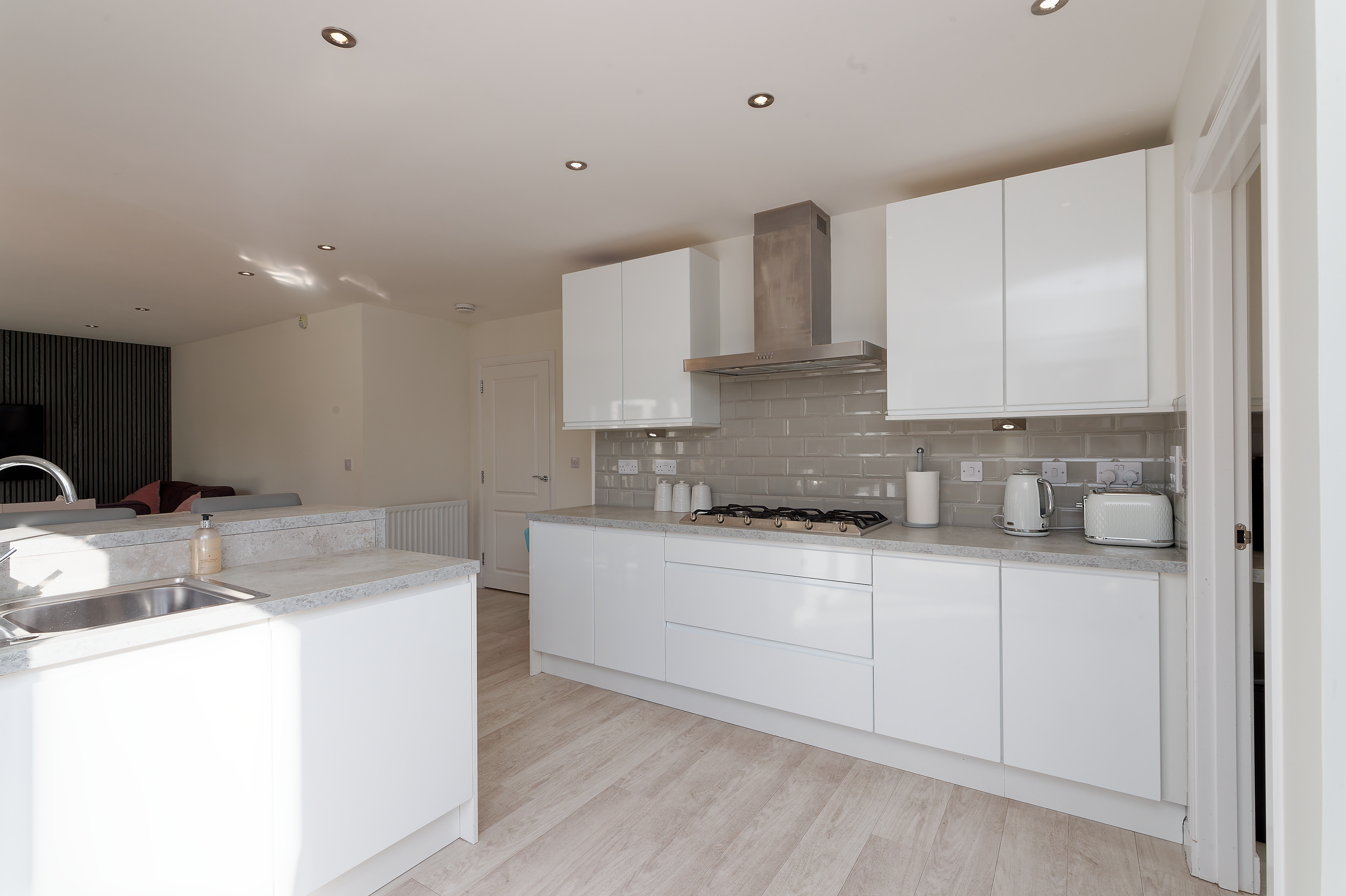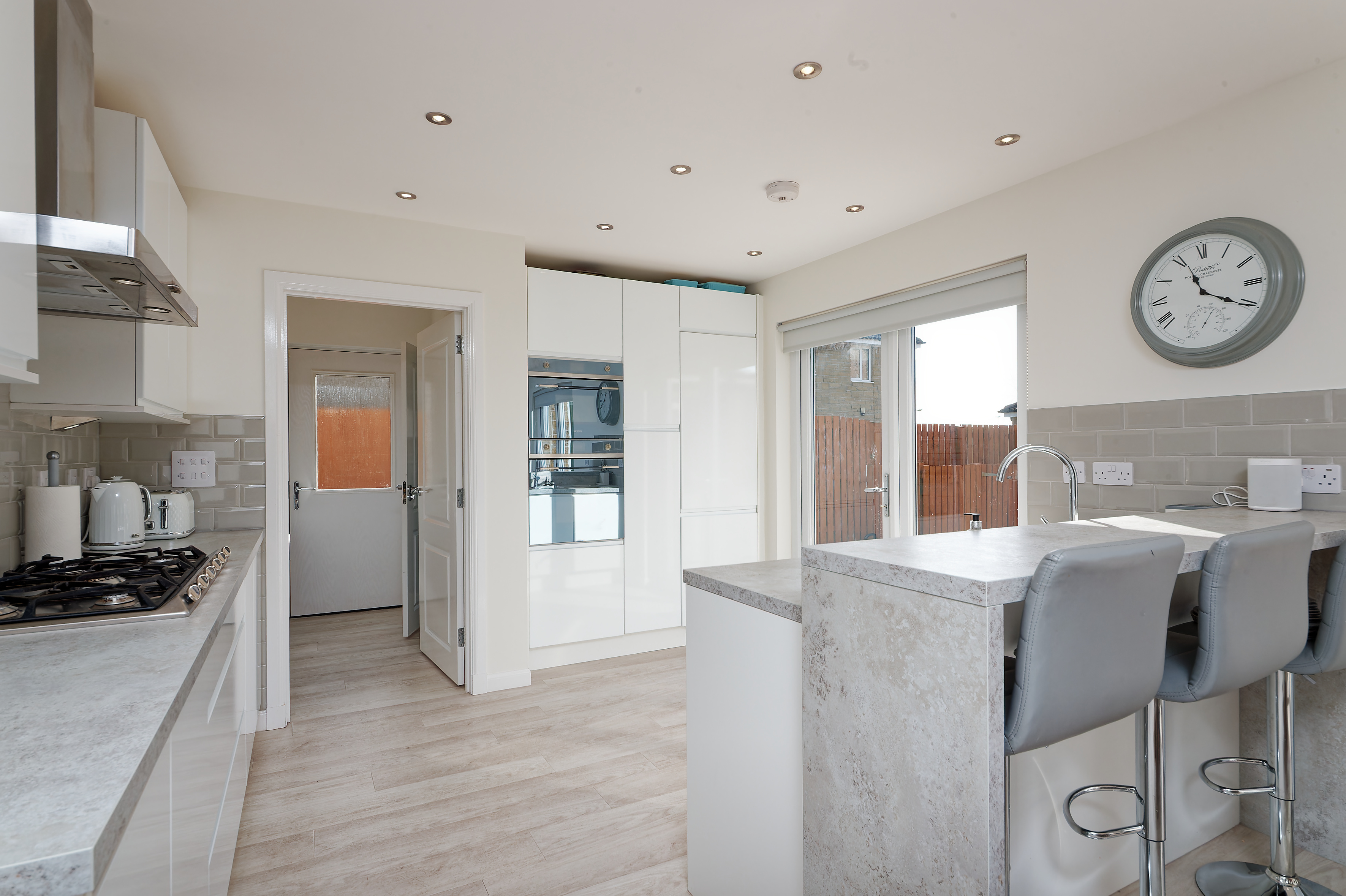 The accommodation comprises reception hallway, front facing lounge, 8m breakfast/dining kitchen with the addition of a garden room off the kitchen providing a spacious flexible layout all with French doors providing easy access to the south facing rear garden. The kitchen has high gloss wall & base units with integrated Smeg appliances that includes hob, oven, extractor hood, fridge freezer and dishwasher. A separate utility room off the kitchen has plumbing, WC off and a Upvc door leading to the side elevation.