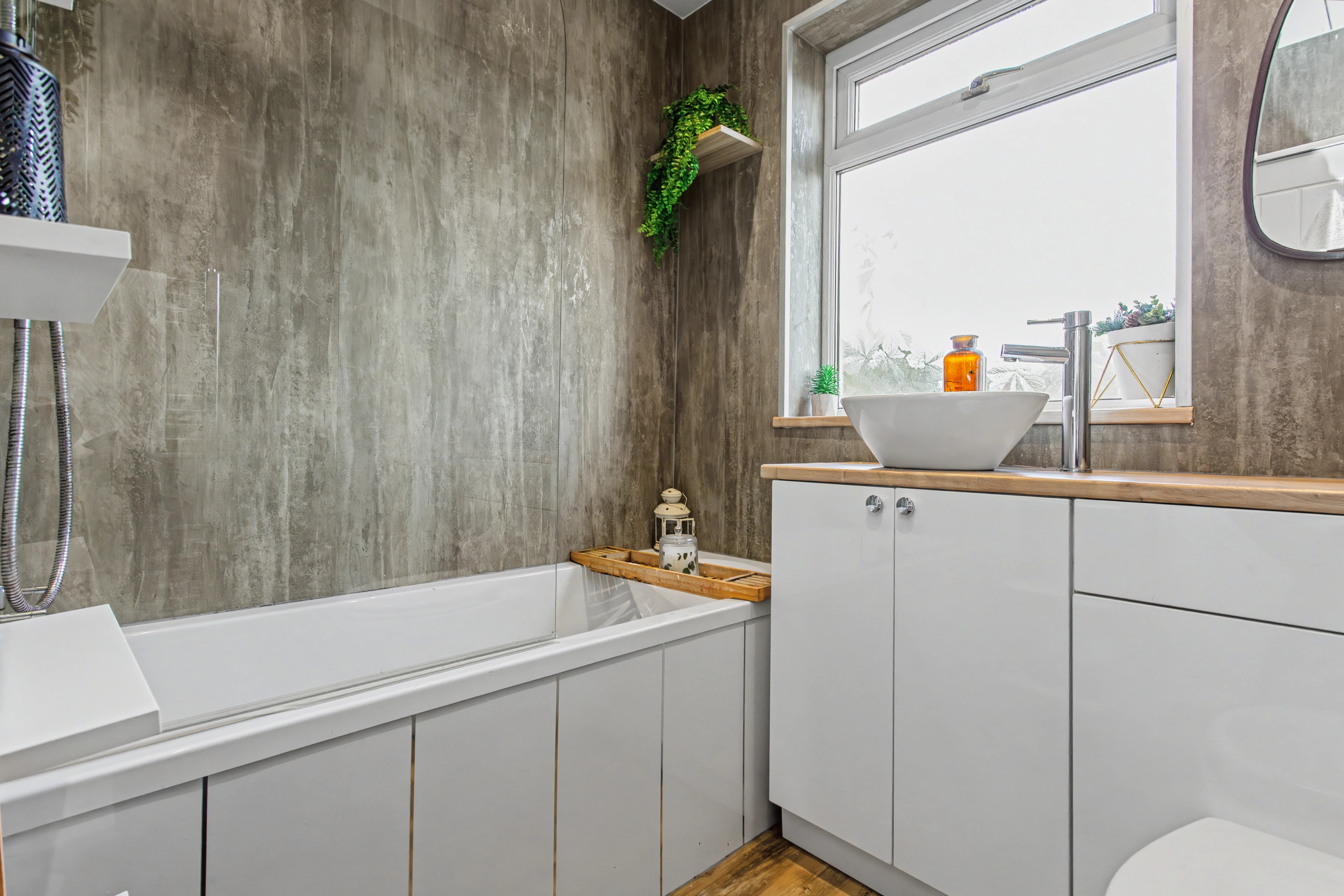 On the first floor there are two double bedrooms and the contemporary house bathroom. There is also a storage cupboard and access to the attic.