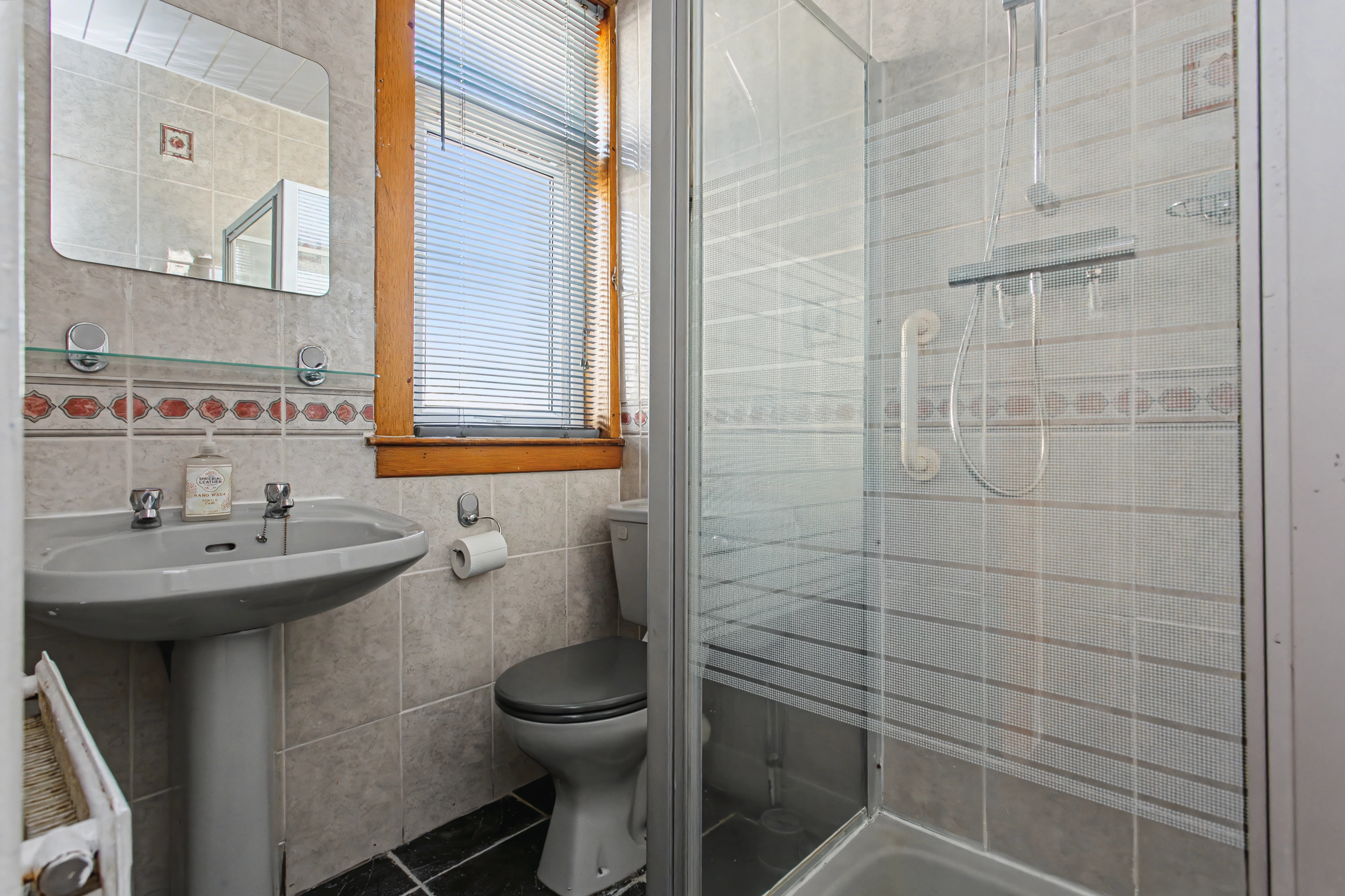 The accommodation is well-proportioned throughout and comprises: a welcoming entrance vestibule with useful storage; a reception hallway providing access to all main apartments and featuring a further storage cupboard; a bright and spacious front-facing lounge with a charming bay window; two generous double bedrooms, both quietly positioned to the rear; a modern shower room with WC, wash hand basin and shower enclosure; and a kitchen with space for fitted units and appliances are included in the sale.