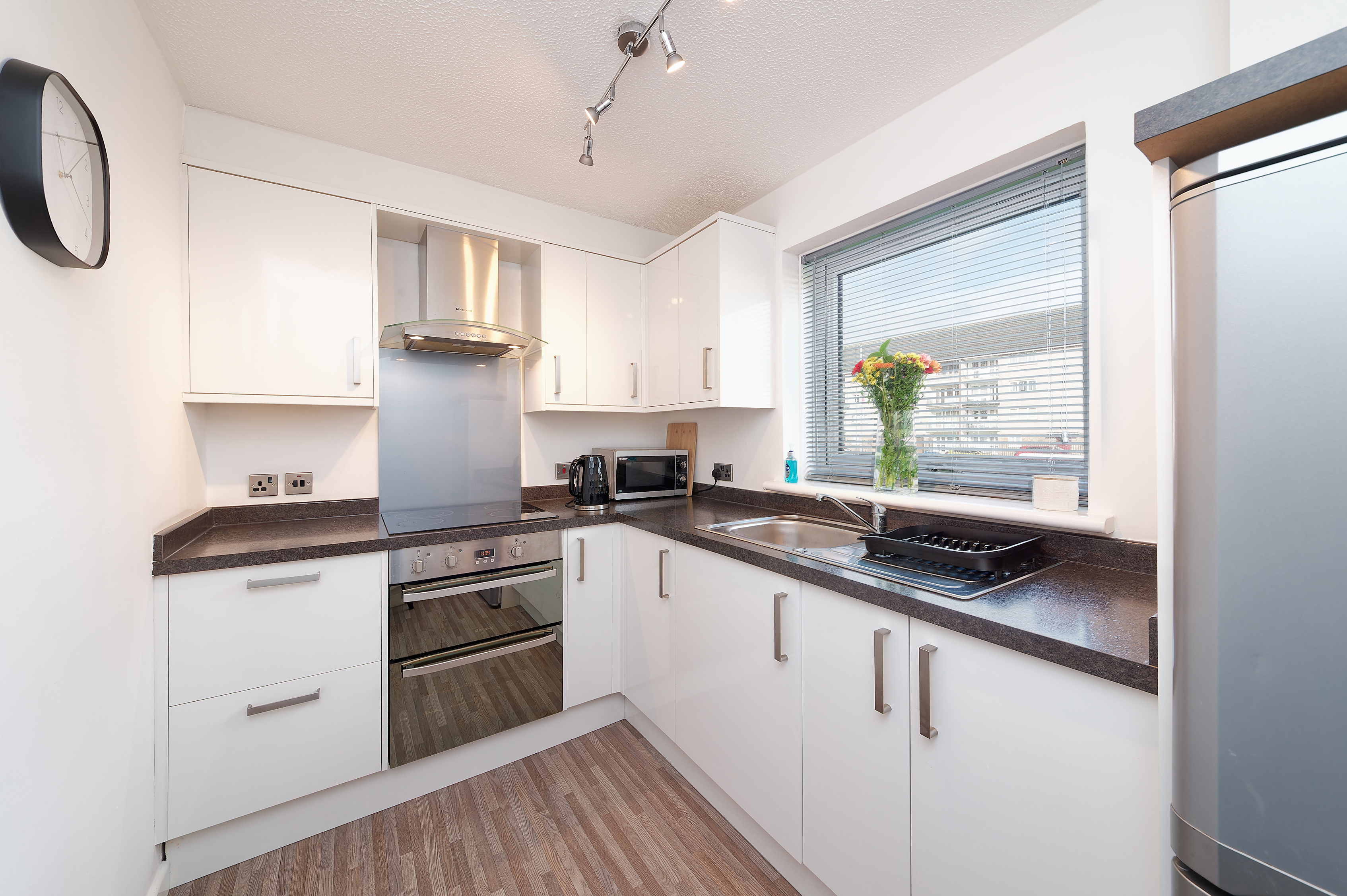 The contemporary fitted kitchen is well-appointed with a range of appliances including an oven, hob, fridge freezer and washing machine, offering both style and practicality.
